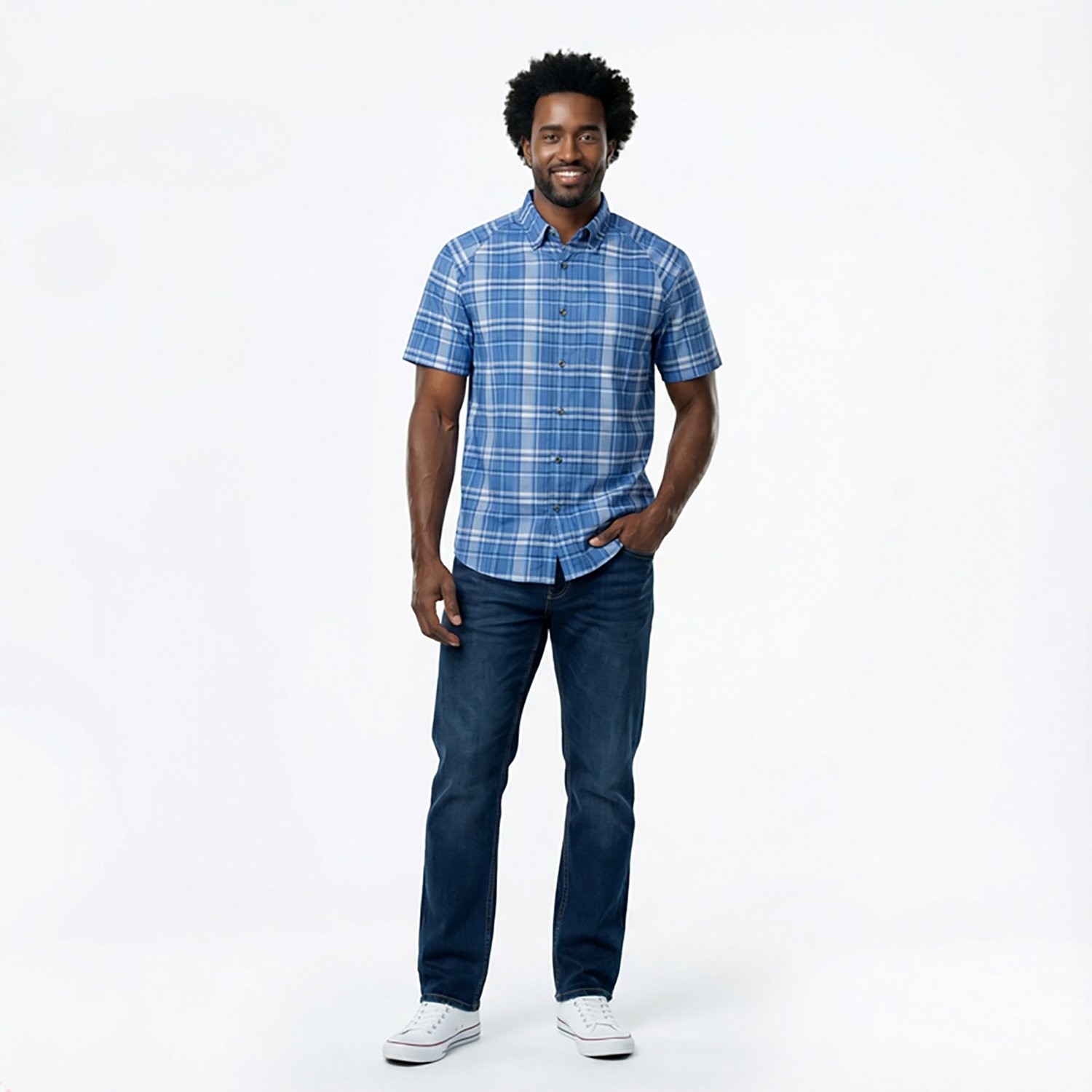 Look your best in the Magellan Outdoors Men's Hickory Canyon Plaid Short Sleeve Shirt. It is made of 96% polyester and 4% spandex. The moisture wicking technology keeps you dry, and its UPF 30 provides protection from the sun so you can stay outside longer. The collar neckline adds a touch of sophistication.