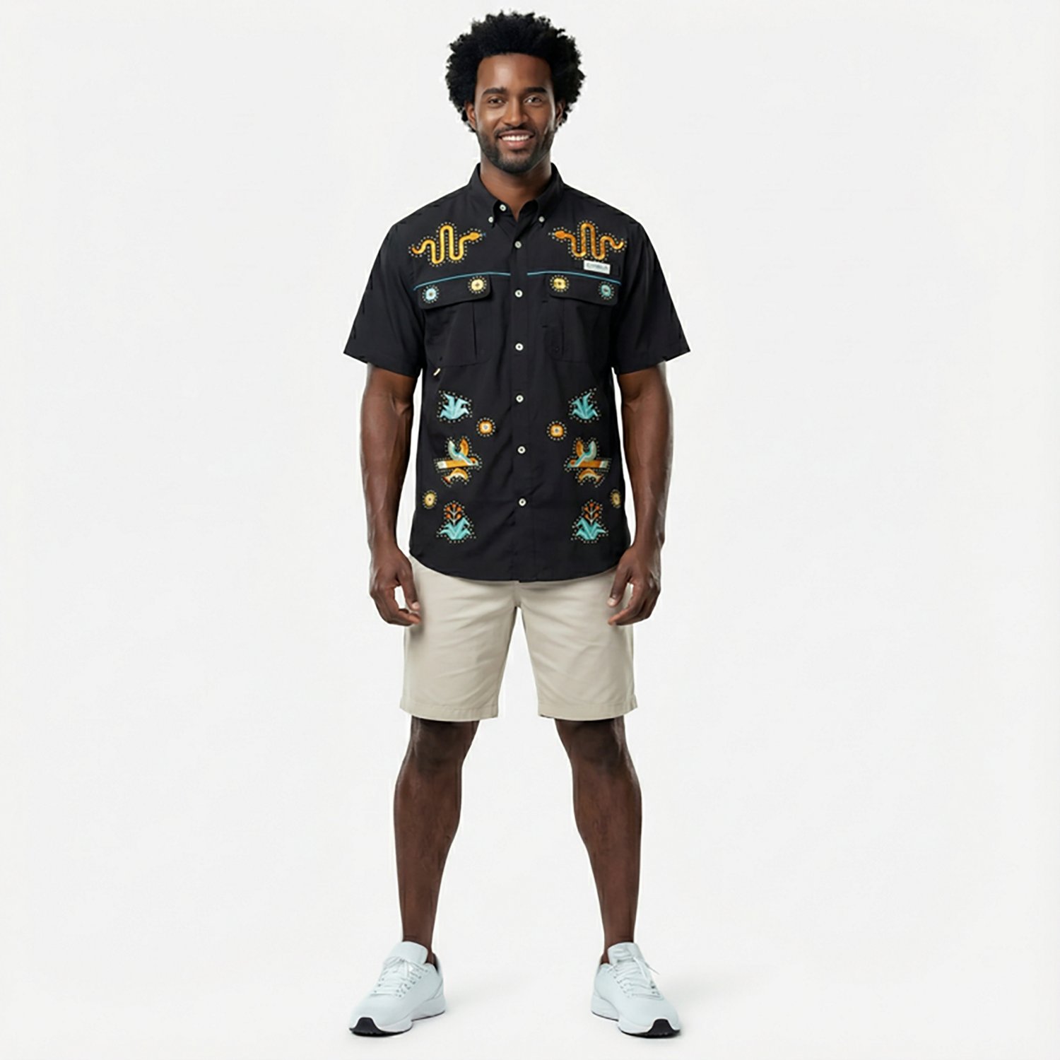 You will look great and feel ready to take on the day when you button up the Magellan Outdoors Men's Hispanic Heritage Desert Scene Guayabera Shirt. This shirt is made of 100% polyester peached poplin with polyester mesh lining for comfort, and it even helps create a barrier against the sun's harmful rays.