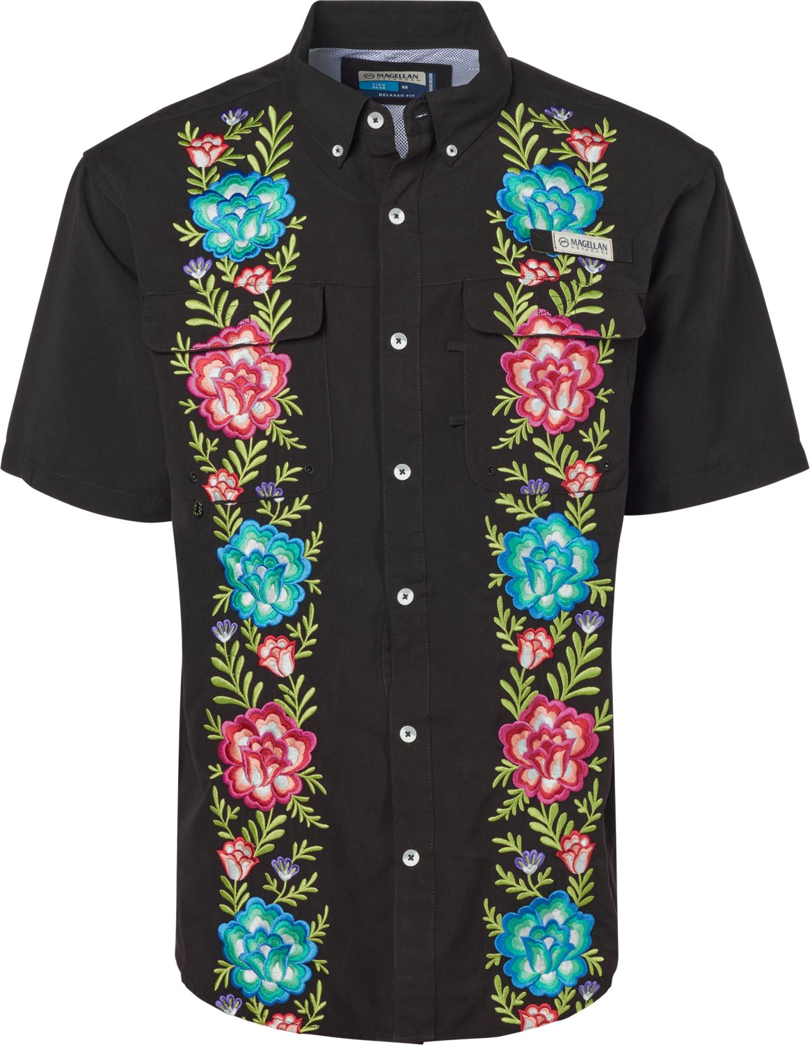 Show support for Hispanic culture while celebrating your style when you wear the Magellan Outdoors Men's Hispanic Heritage Flores Guayabera Shirt. This shirt is made of 100% polyester with polyester mesh lining for comfort and breathability, and the moisture-wicking properties and UPF protectant make it great for sunny days.