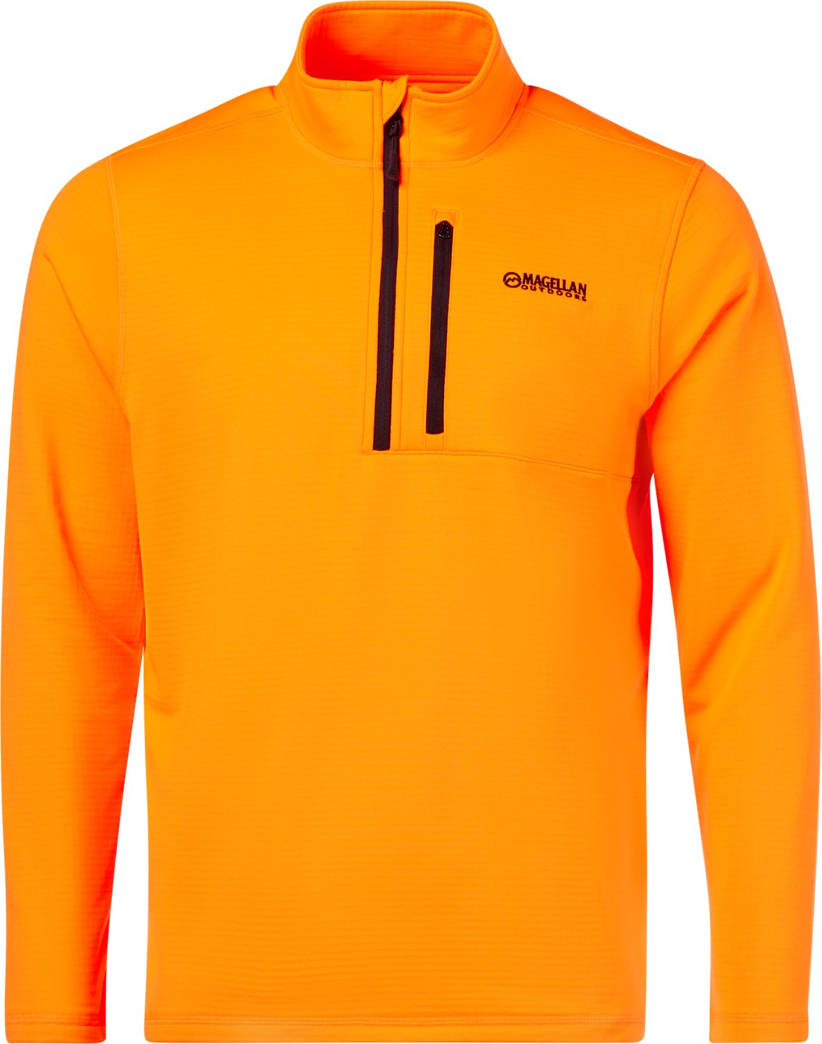 Enter the wilderness with the Magellan Outdoors Men's HuntGear Crockett 1/4 Zip Long Sleeve Pullover. The blaze orange color offers high visibility, and the zippered front pocket conveniently stores valuables.
