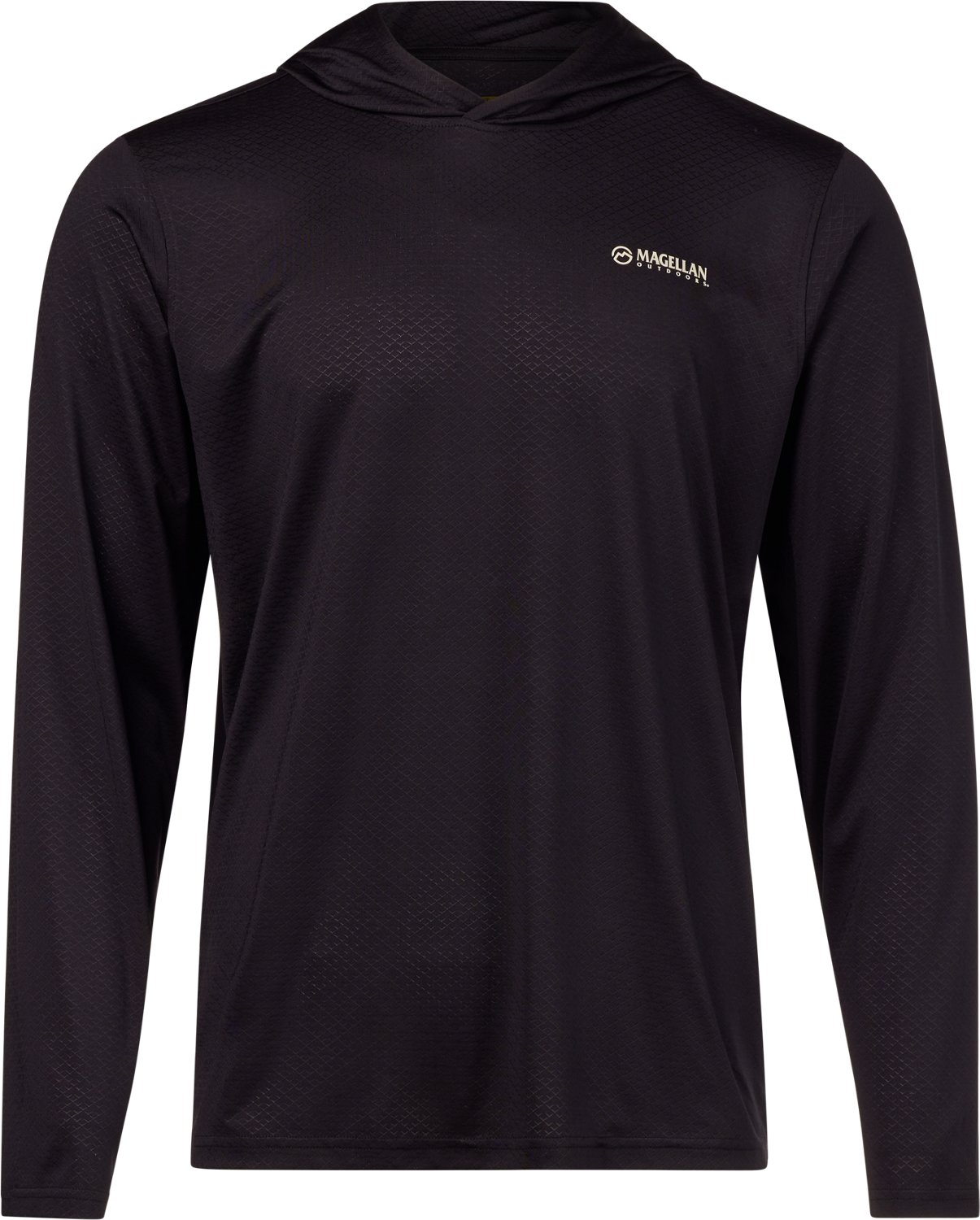Stay comfortable from the backyard to the woods in this Magellan Outdoors Men's HuntGear Eagle Pass Long Sleeve Tech Mesh Hooded Shirt. It is made of 92% polyester and 8% spandex for durability and flexibility, and the shirt boasts a hood to help keep your head warm.