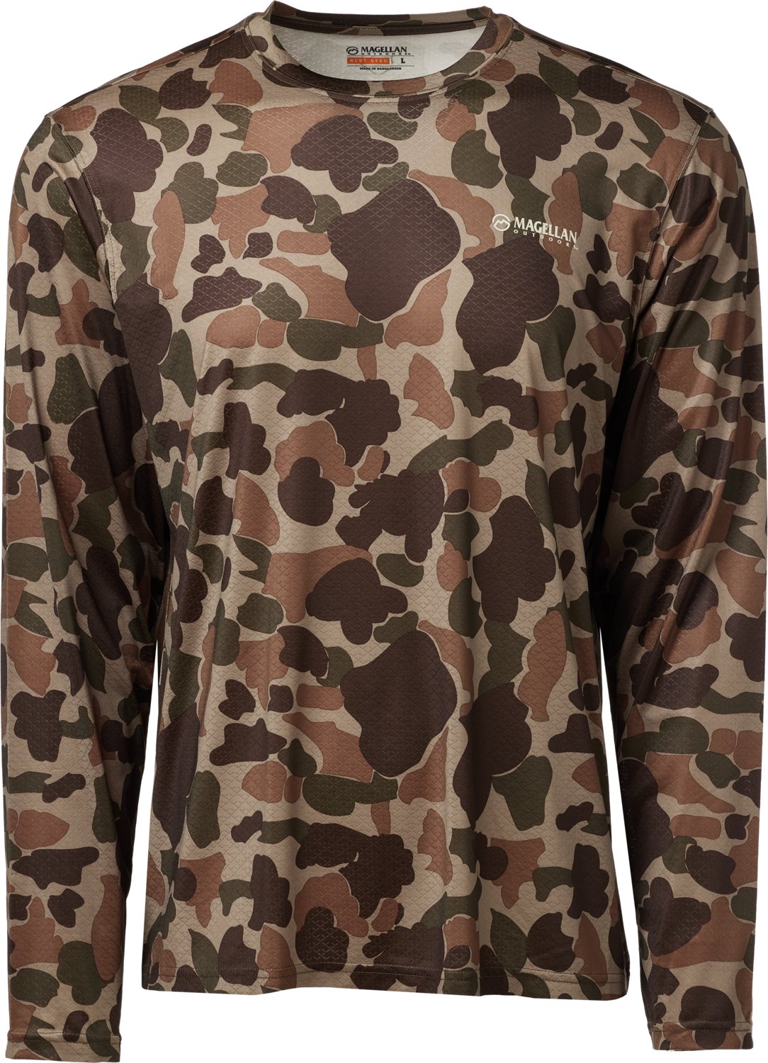 Head to the field in the Magellan Outdoors Hunt Gear Men's Eagle Pass Tech Mesh Long Sleeve T-shirt. This T-shirt is made of polyester and spandex mesh fabric for comfortable wear. The moisture wicking technology helps keep you cool and dry, while the camo print offers concealability.
