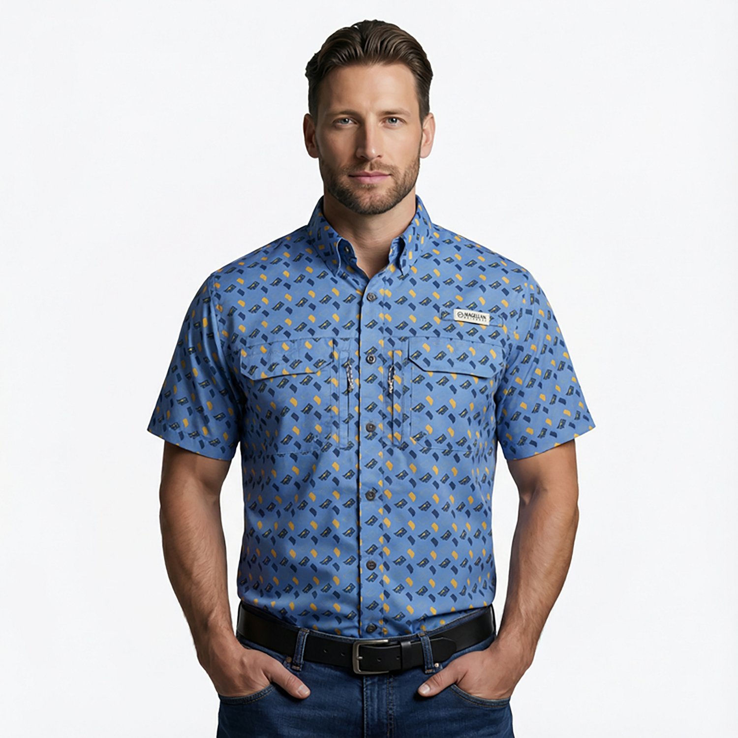 Show off your local roots with the Magellan Outdoors Men's Indiana Local State Print Shirt. This lightweight polyester shirt with integrated UPF technology wicks away sweat and has a mesh liner to help you stay cool, dry and comfortable all day while protecting your skin from UV rays. This button-down shirt is easy to take off after a long day and features an Indiana-inspired print to add style.