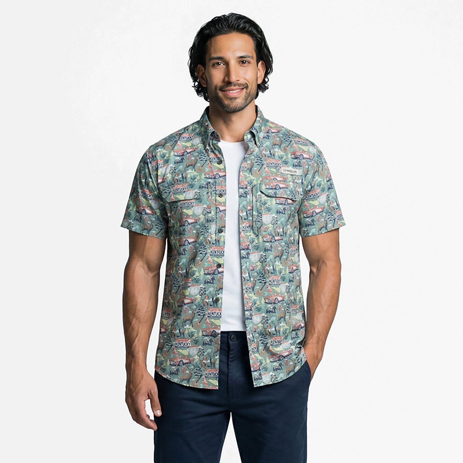 Show everyone where you're from with the Magellan Outdoors Men's Kentucky Local State Print Shirt. This button-down shirt is made of polyester twill with moisture-wicking technology for a dry, comfortable feel. The graphic design highlights your southern roots. UPF 30 sun protection. Short sleeves.