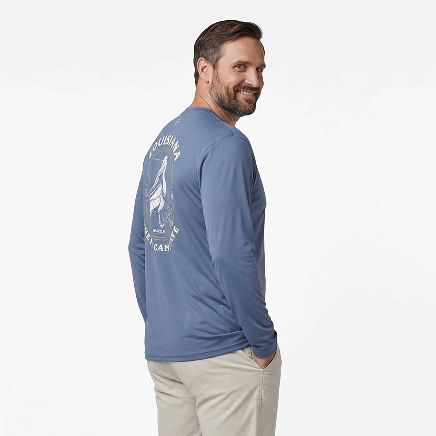 Look your best when you wear the Magellan Outdoors Men's Local State Louisiana Graphic Crew Long Sleeve T-shirt. It is made of 100% recycled polyester. The moisture wicking technology keeps you dry and comfortable, and its UPF 50+ rating provides protection against the sun's harsh rays. The crew neckline creates a casual look.