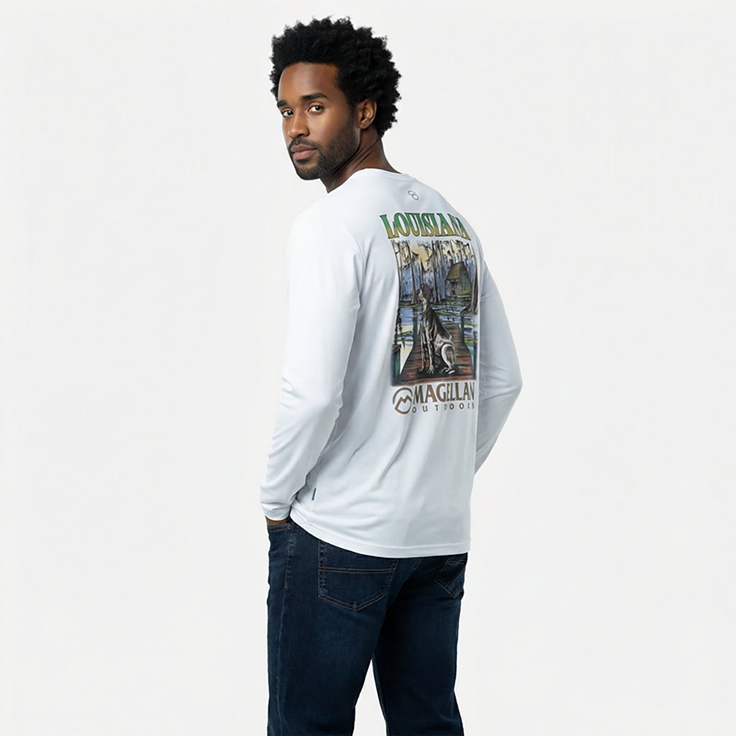 Represent your home state with the Magellan Outdoors Men’s Local State Louisiana Long Sleeve Graphic T-shirt. The polyester knit interlock fabric provides a comfortable feel, while the moisture wicking technology helps keep you cool and dry. UPF 50 sun protection shields against harmful UV rays, and the graphic design delivers a stylish touch.
