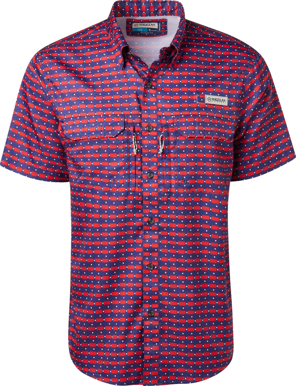 Stay comfortable while fishing in this Magellan Outdoors Men's Local State Print Pattern Short Sleeve Shirt. It is made of 100% polyester for durability and a lightweight feel, and the shirt is made with moisture-wicking fabric to help keep you dry.