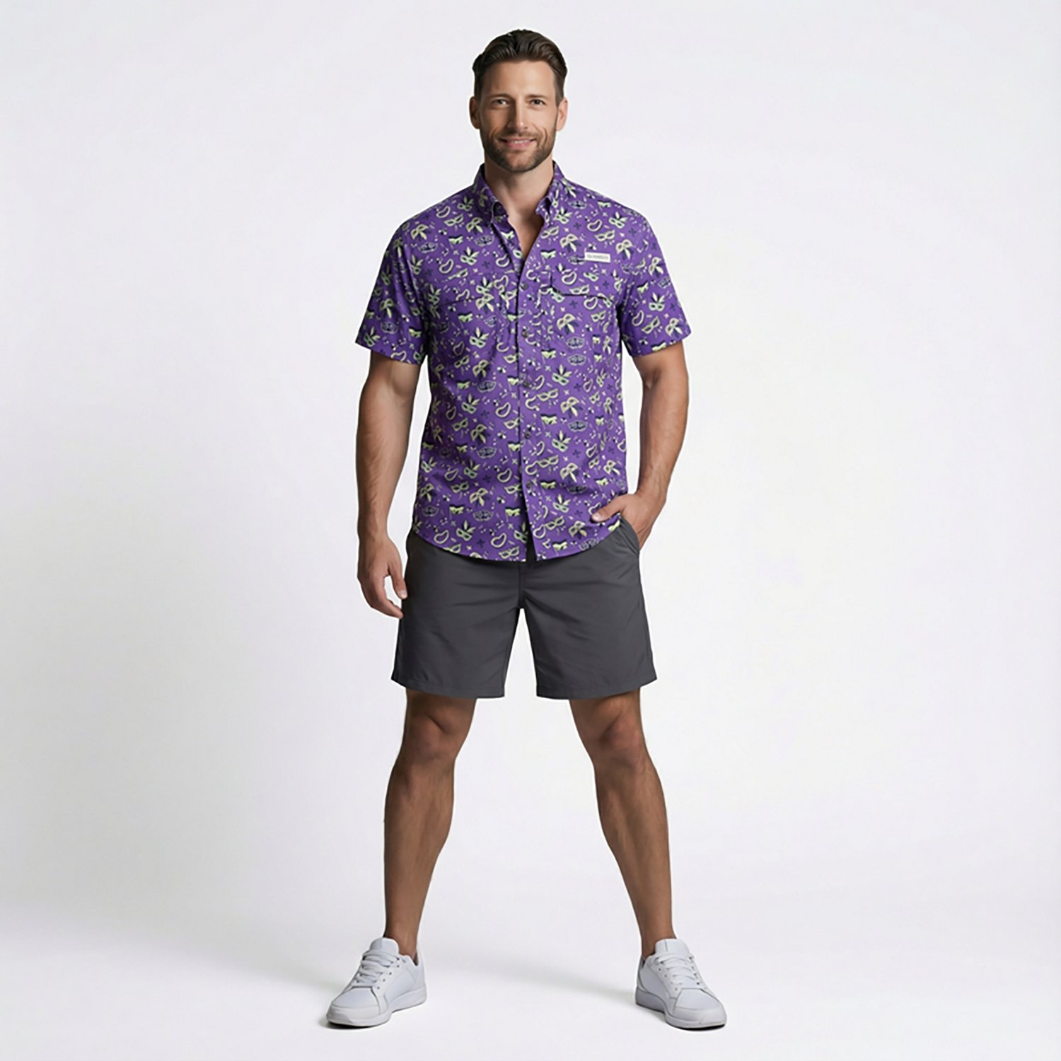 Celebrate the season in the Magellan Outdoors Men's Mardi Gras Print Short Sleeve Shirt. This lightweight button-down top is made from woven polyester twill with moisture-wicking fibers and UPF 30 protection. A Mardi Gras-themed print elevates your look.