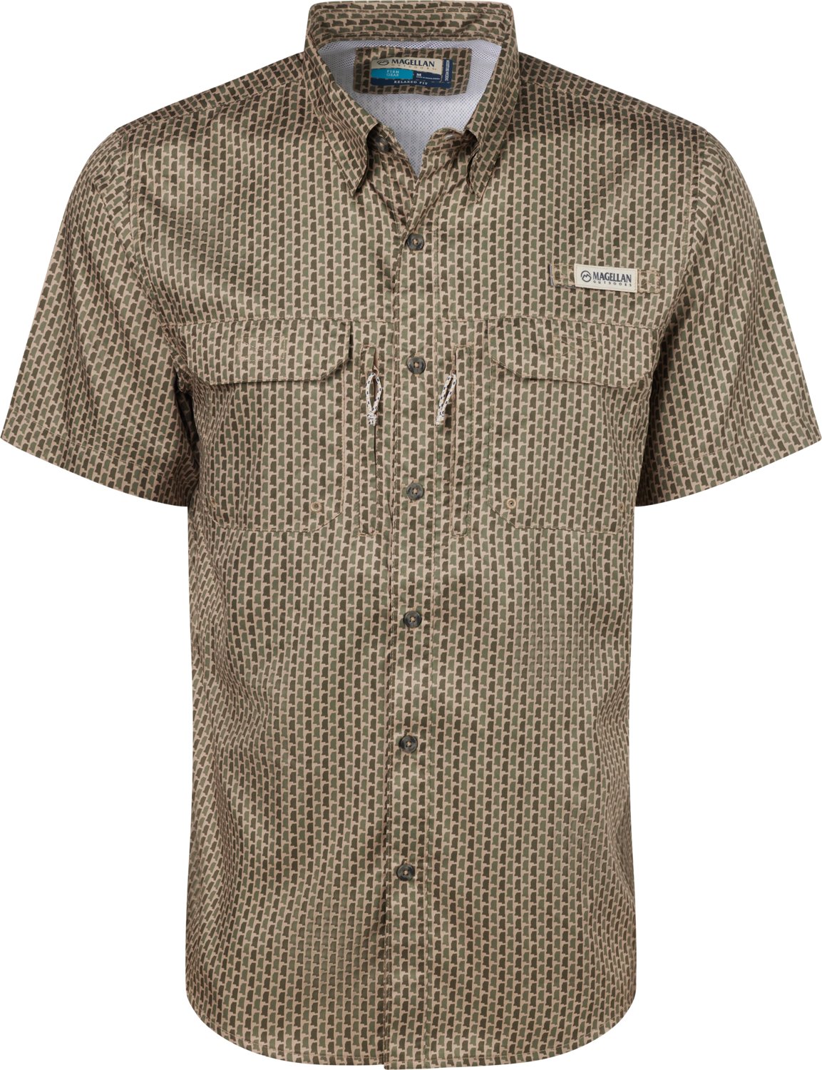 Show everyone where you're from with the Magellan Outdoors Men's Mississippi Local State Print Shirt. This button-down shirt is made of polyester twill with moisture-wicking technology for a dry, comfortable feel. The graphic design highlights your southern roots. UPF 30 sun protection. Short sleeves.