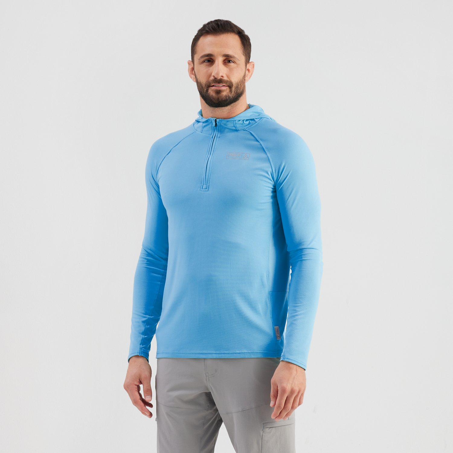 Protect yourself during long fishing days with the Magellan Outdoors Men's Pro Jacob Wheeler Angler Gaiter Hoodie. This lightweight nylon hoodies moves as you do for comfortable wear. With moisture-wicking and cooling technology, you'll stay dry and comfy all day, and the antimicrobial properties help block odor. The attached hood and UPF 50 attributes provide additional protection against the sun.