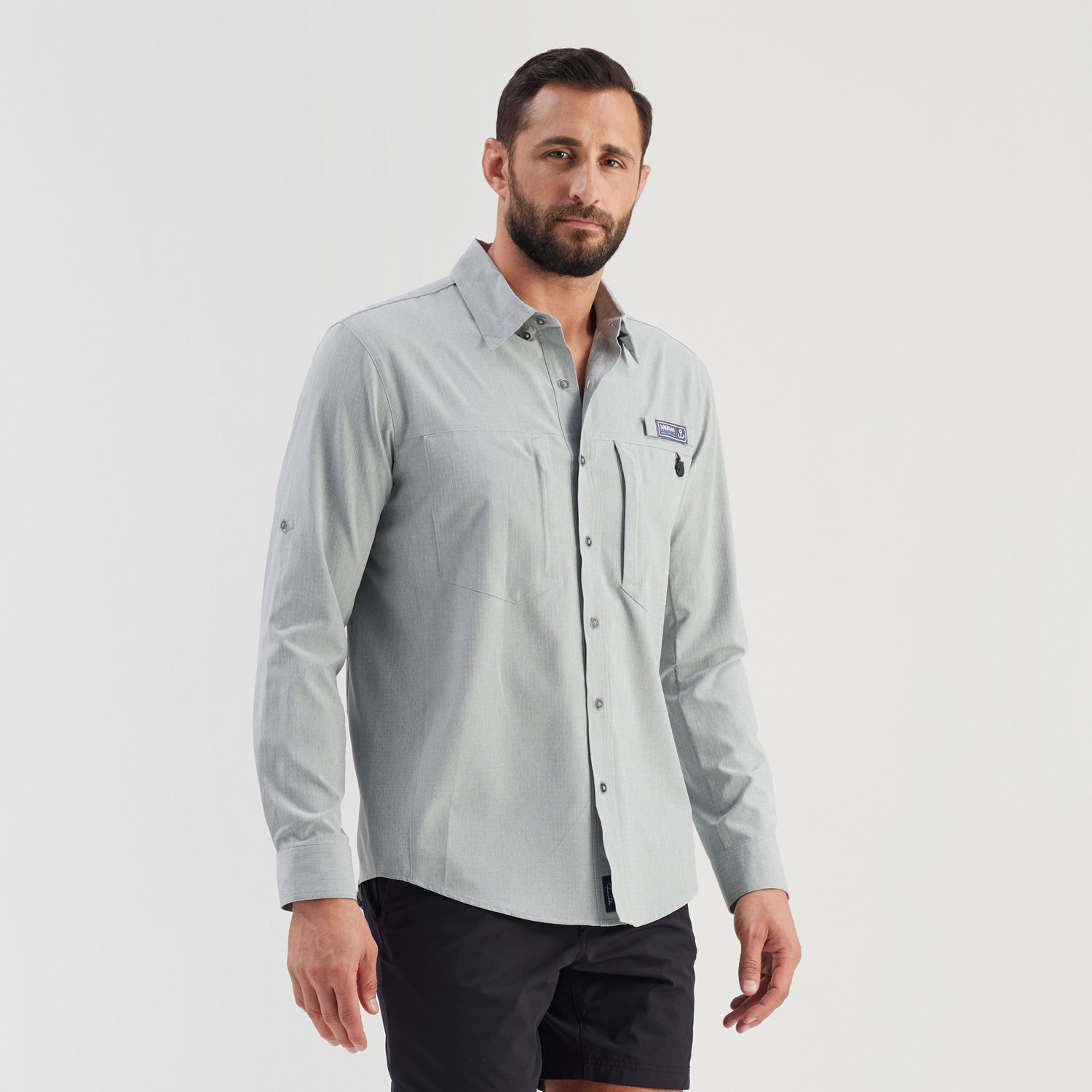 The Magellan Outdoors Men's Jacob Wheeler Angler Long Sleeve Shirt is designed for fishing comfort. This men's angler long sleeve shirt features a lightweight blend of 92% polyester and 8% spandex, with Flex technology for movement. The button-down collar shirt offers moisture-wicking and quick-drying fabric to help you stay dry. Cooling technology increases comfort. UPF 50 sun protection shields your skin from UV rays. Antimicrobial technology helps prevent odor buildup. A patented line cutting button is also included.