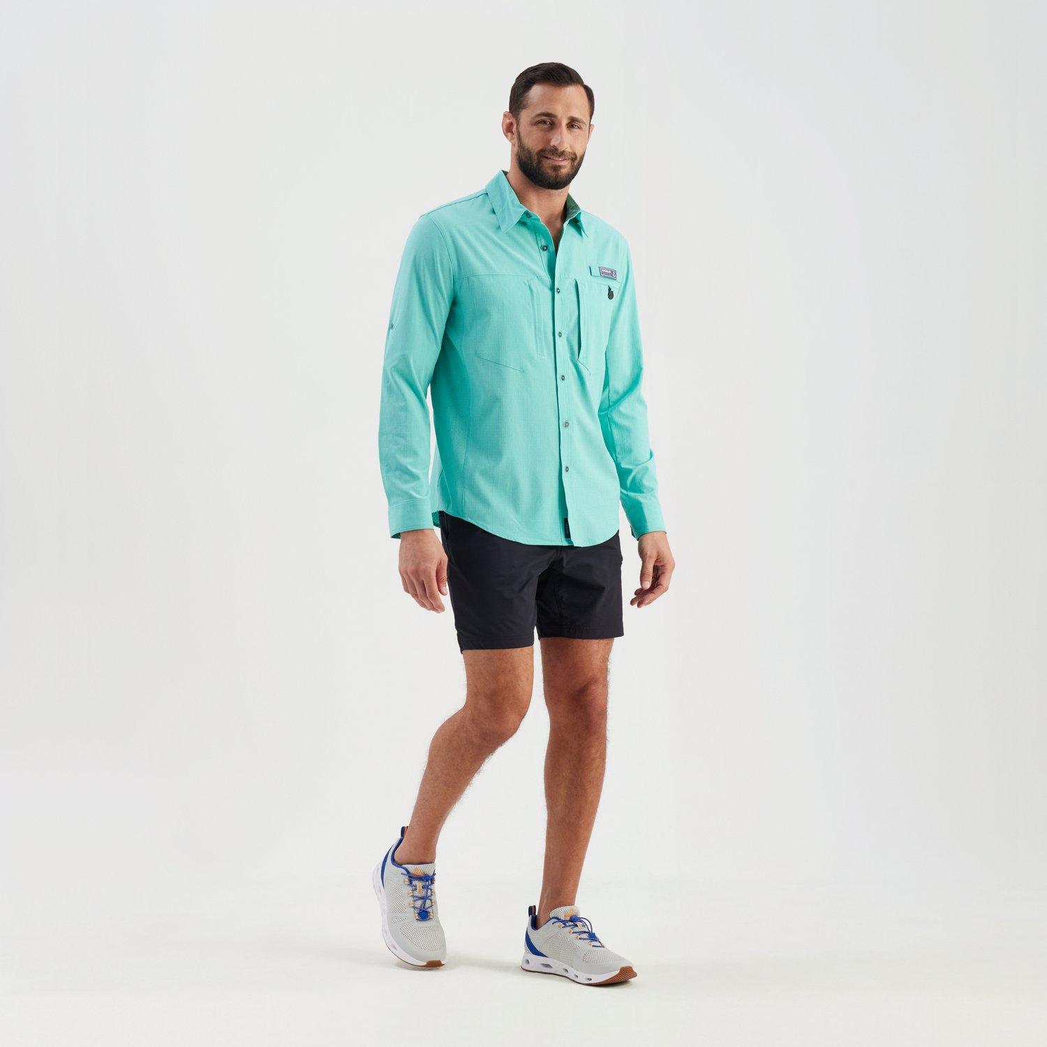 The Magellan Outdoors Men's Jacob Wheeler Angler Long Sleeve Shirt is designed for fishing comfort. This men's angler long sleeve shirt features a lightweight blend of 92% polyester and 8% spandex, with Flex technology for movement. The button-down collar shirt offers moisture-wicking and quick-drying fabric to help you stay dry. Cooling technology increases comfort. UPF 50 sun protection shields your skin from UV rays. Antimicrobial technology helps prevent odor buildup. A patented line cutting button is also included.