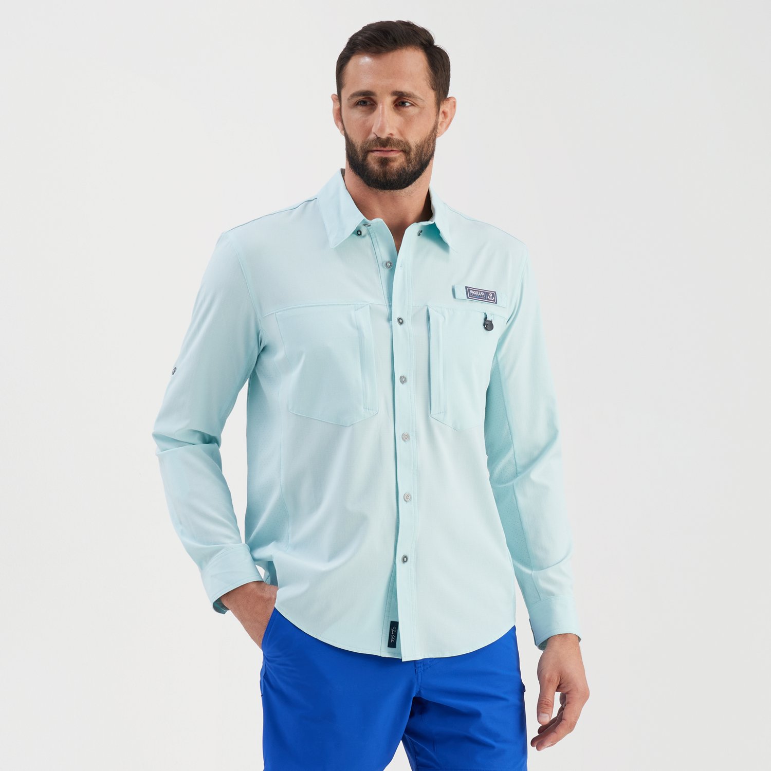 The Magellan Outdoors Men's Jacob Wheeler Angler Long Sleeve Shirt is designed for fishing comfort. This men's angler long sleeve shirt features a lightweight blend of 92% polyester and 8% spandex, with Flex technology for movement. The button-down collar shirt offers moisture-wicking and quick-drying fabric to help you stay dry. Cooling technology increases comfort. UPF 50 sun protection shields your skin from UV rays. Antimicrobial technology helps prevent odor buildup. A patented line cutting button is also included.