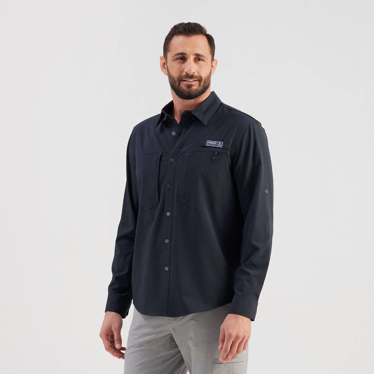 Stay cool while fishing with the Magellan Outdoors Men's Pro Jacob Wheeler Angler Long Sleeve Shirt This lightweight button-down shirt is designed to keep you cool and dry with the moisture-wicking, quick-drying blend of spandex and polyester that moves with you. The UPF 50 sun protection shields your skin from UV rays, and the antimicrobial technology helps prevent odor from building up.