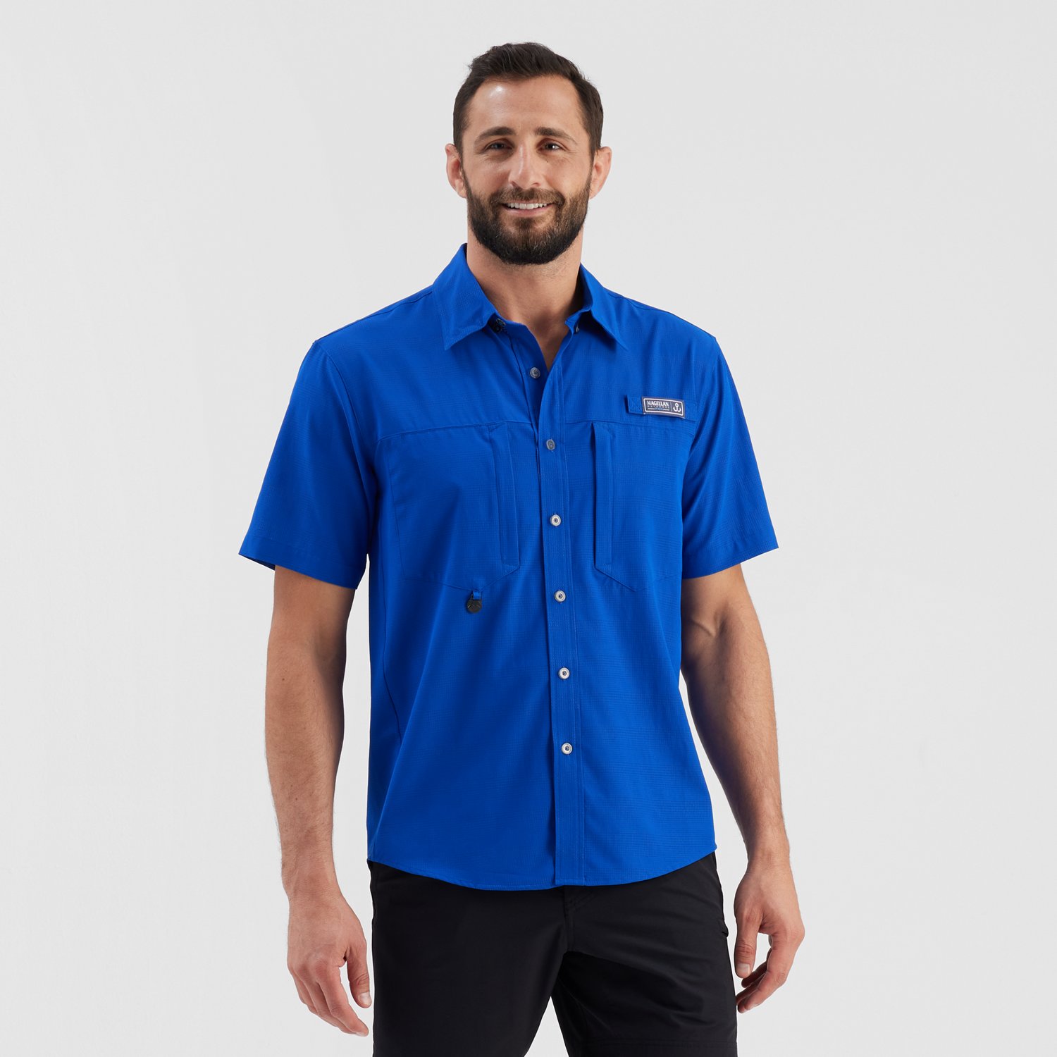 Stay cool during long fishing days with the Magellan Outdoors Men's Pro Jacob Wheeler Angler Short Sleeve Shirt. This button-down shirt is made of a lightweight blend of polyester and spandex for comfortable stretch. The moisture-wicking, quick-drying fabric utilizes cooling technology to help you stay cool and dry all day, while the antimicrobial properties help shield against odor, keeping you fresh.