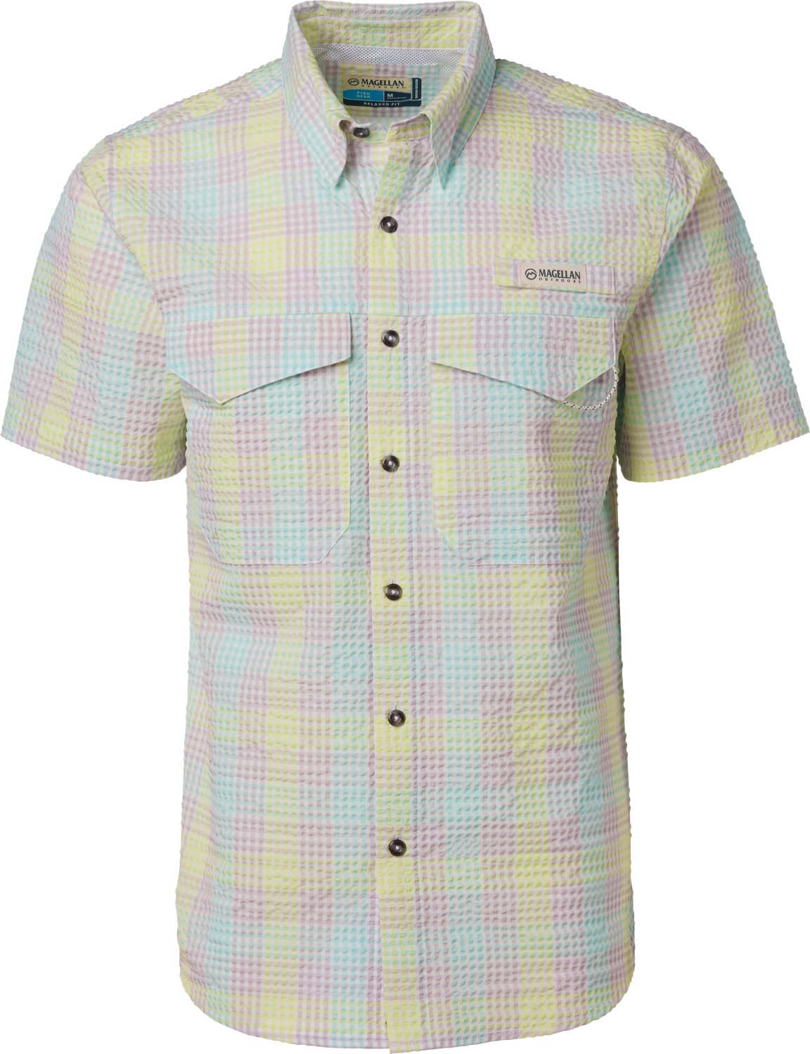 Stay cool and comfortable this summer by wearing the Magellan Outdoors Men's Southern Summer Gingham Plaid Short Sleeve Shirt. The lightweight seersucker material is ventilated for airflow. Moisture-wicking technology helps keep you cool and dry, while a plaid print adds a stylish look.