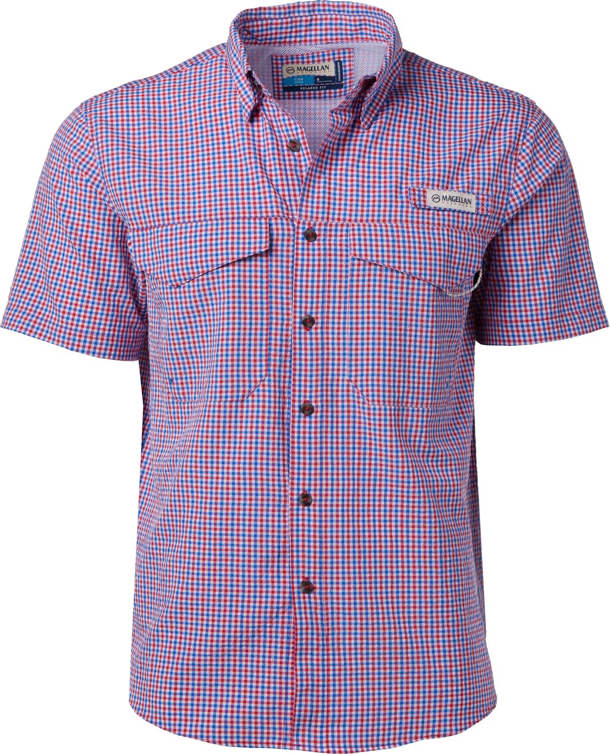 Bring comfort and style out on the water in the Magellan Outdoors Men's Southern Summer Seersucker Plaid Short Sleeve Shirt. The polyester and nylon woven fabric supplies a lightweight, breathable fit, and the seersucker plaid design adds style to your appearance. The moisture-wicking technology helps keep you dry and comfortable, while the UPF 30 treatment provides protection against harsh sun.