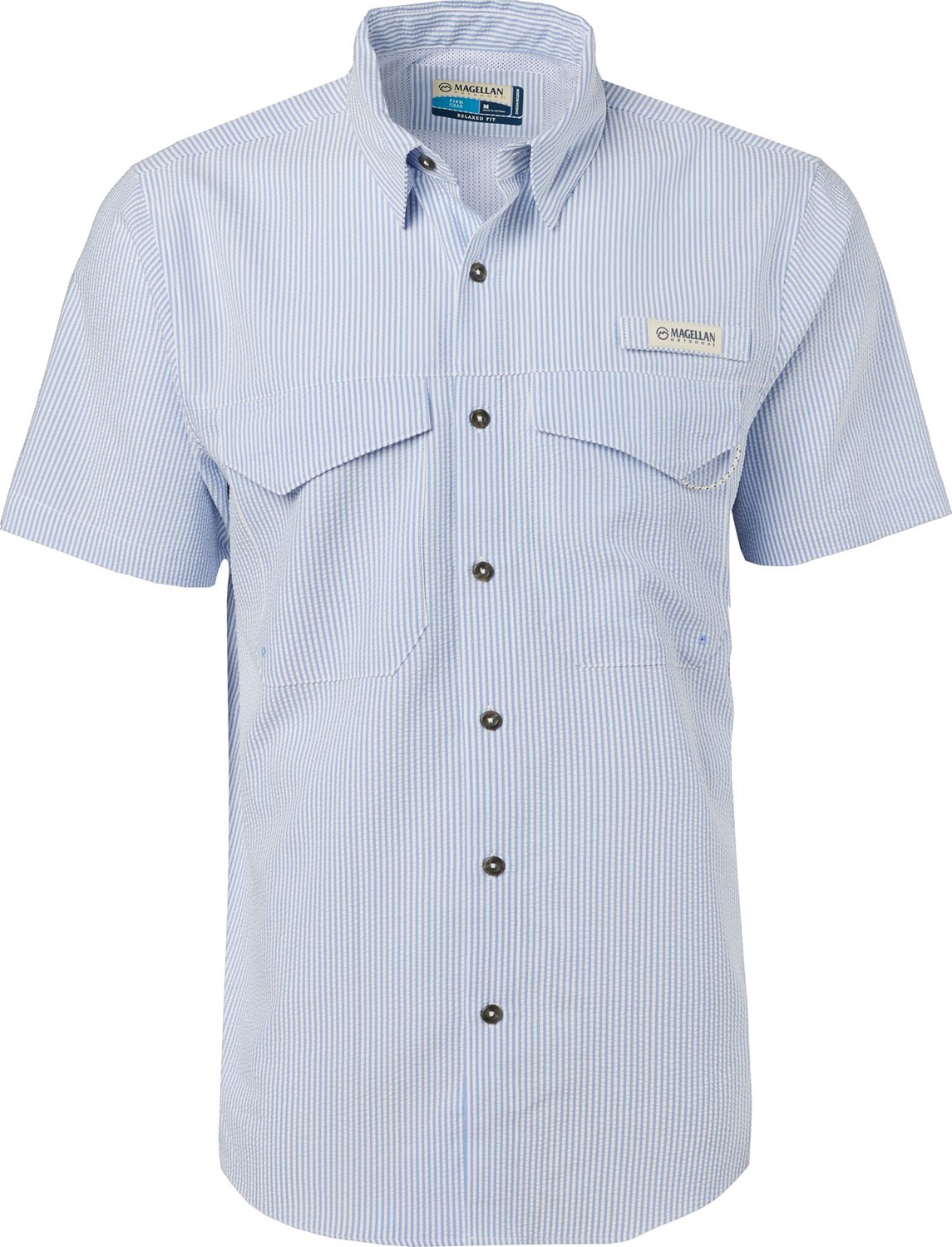 Bring comfort and style out on the water in the Magellan Outdoors Men's Southern Summer Seersucker Traditional Short Sleeve Shirt. The polyester and nylon woven fabric supplies a lightweight, breathable fit, and the seersucker striped design adds style to your appearance. The moisture-wicking technology helps keep you dry and comfortable, while the UPF 30 treatment provides protection against harsh sun.