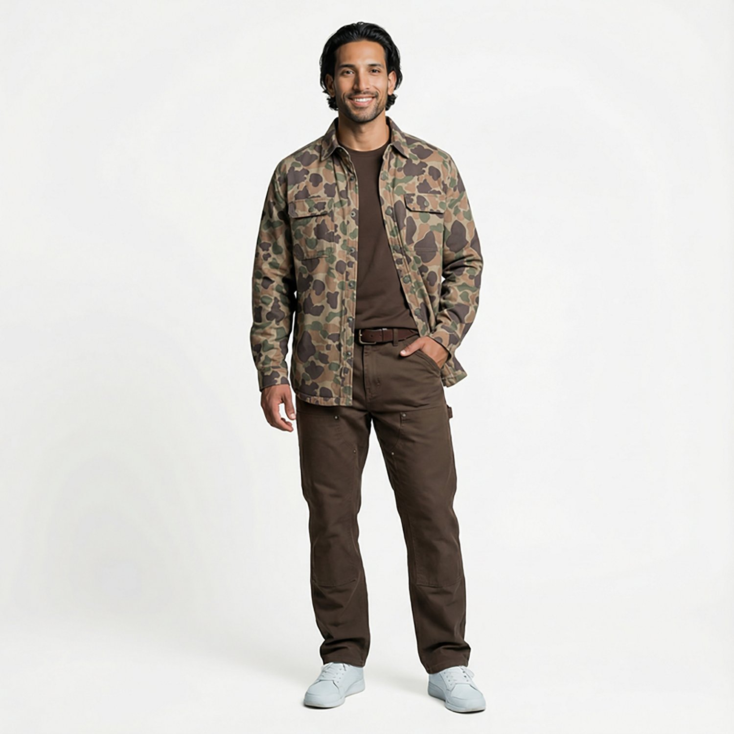 Stay warm on mild-weather hunts with the Magellan Outdoors Men's Stonewell Shirt Jacket. This midweight button-down shirt jacket is made of cotton and spandex for comfortable stretch and has a twill liner for added warmth without adding weight. The button cuffs allow you to adjust the length of the sleeves, and the camo print helps you move stealthily through the woods.