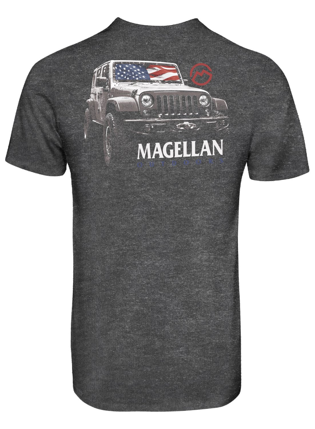 Look your best in the Magellan Outdoors Men's Truck Poster Short Sleeve Graphic T-shirt. It is made of 65% polyester and 35% cotton. The short sleeves keep you cool, and its front chest is decorated with the Magellan Outdoors logo. The back has a Jeep with an American flag screen printed on.