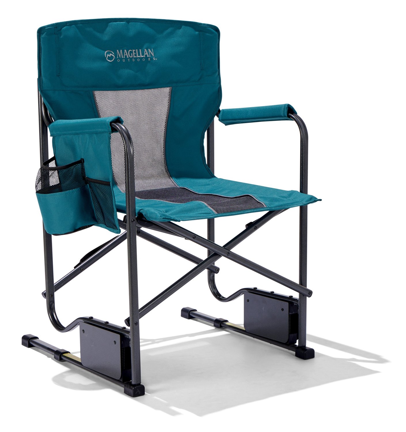 Rock back and forth on the Magellan Outdoors Odyssey Rocker Chair. The 600-denier fabric and powder-coat steel frame offer durability, while the sandwich mesh and padded armrests provide comfort. The spring rocking mechanism enables gentle rocking across most surfaces, and a hand strap on the frame allows for easy carrying.
