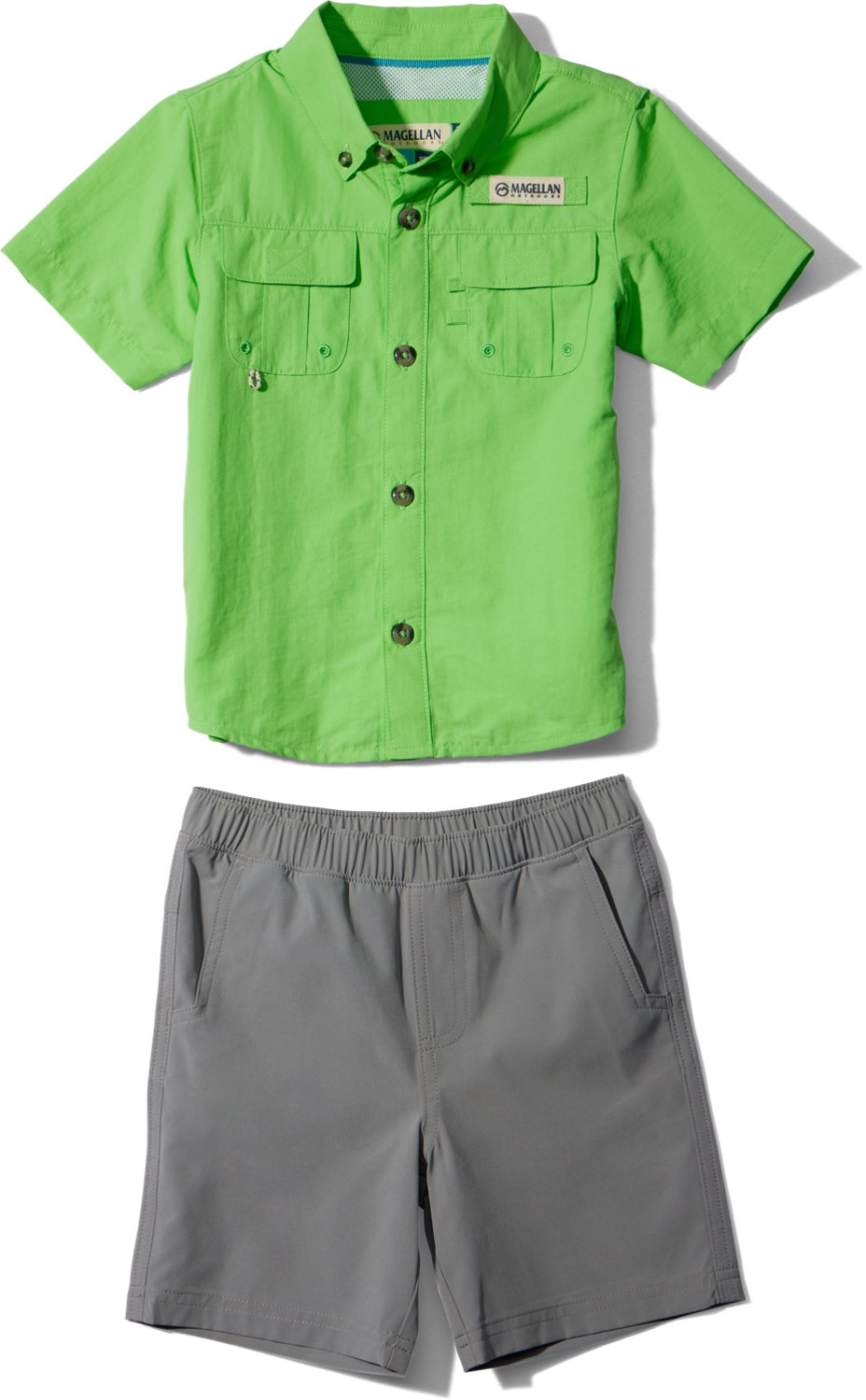 Get your little adventurer ready for the shore in the Magellan Outdoors Toddler Boys' Laguna Madre Short-Sleeve Shirt and Shorts Set. The shirt and shorts feature moisture-wicking technology and UPF 30 protection to keep him feeling fresh and comfortable all day long. Quick-drying technology and a water-repellant finish help him stay dry.