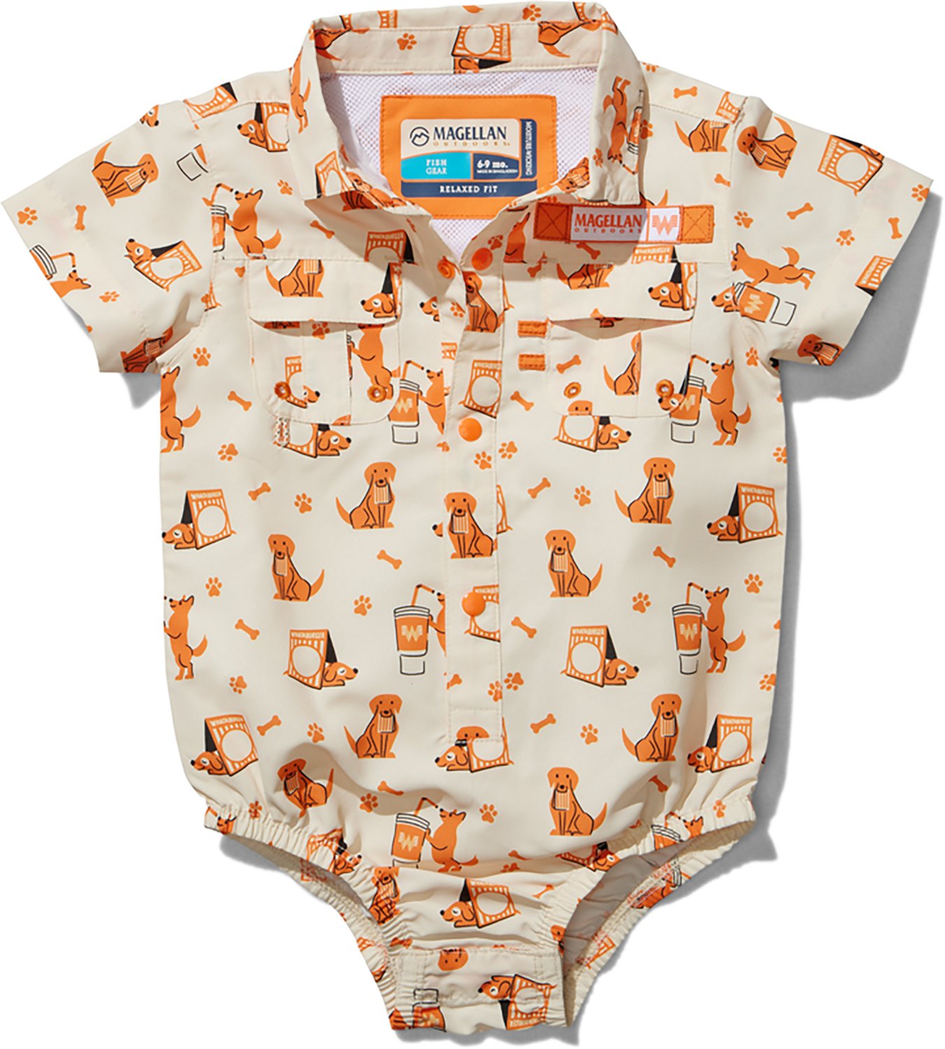 Let your little one enjoy the sun in style with the Magellan Outdoors Whataburger Boys' Infant Whatabarker Onesie. The knit 100% polyester construction is lightweight with a bit of stretch, and the UPF 30 fabric helps protect from the sun's harmful rays.