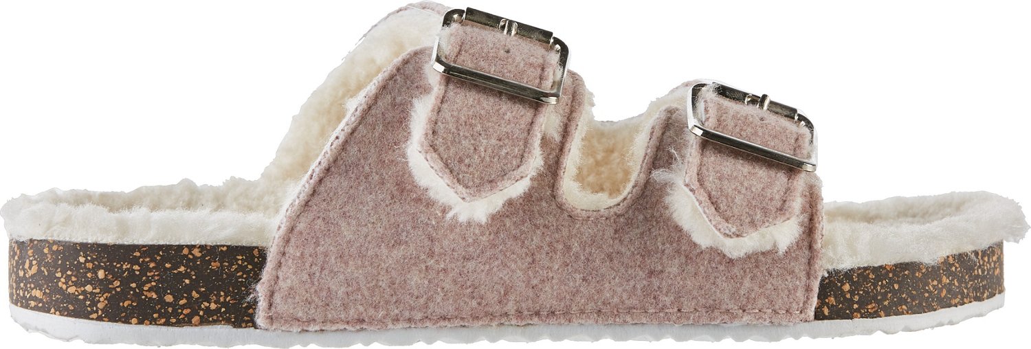 Enjoy a cozy feel with the Magellan Outdoors Women's 2-Buckle Faux Fur Slippers. These slippers feature faux fur linings and footbeds for comfort and PVC outsoles for durability. The slippers also have man-made uppers and 2-buckle adjustable closures.