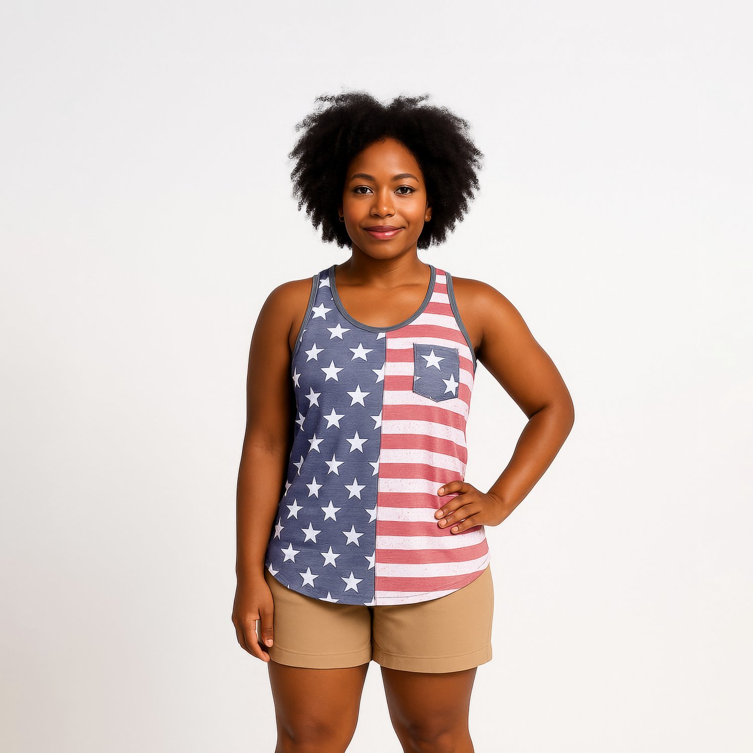 Look your best in the Magellan Outdoors Women's Americana Tank Top. It is made of 65% polyester and 35% rayon. The sleeveless design keeps you cool, and its scoop neckline offers a casual style. The allover American flag pattern brings out a patriotic vibe.