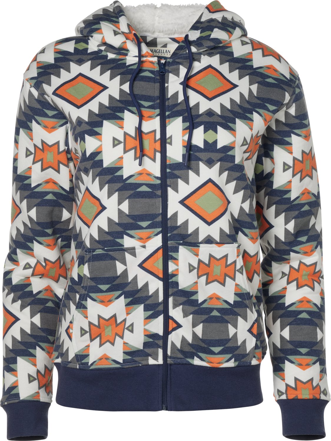Stay warm when you wear the Magellan Outdoors Women's Campfire Sherpa Lined Hooded Jacket. It is made of 60% cotton and 40% polyester. The outer fleece offers a comfy feel, and its inner Sherpa lining enhances warmth. The full zip closure creates a secure fit.
