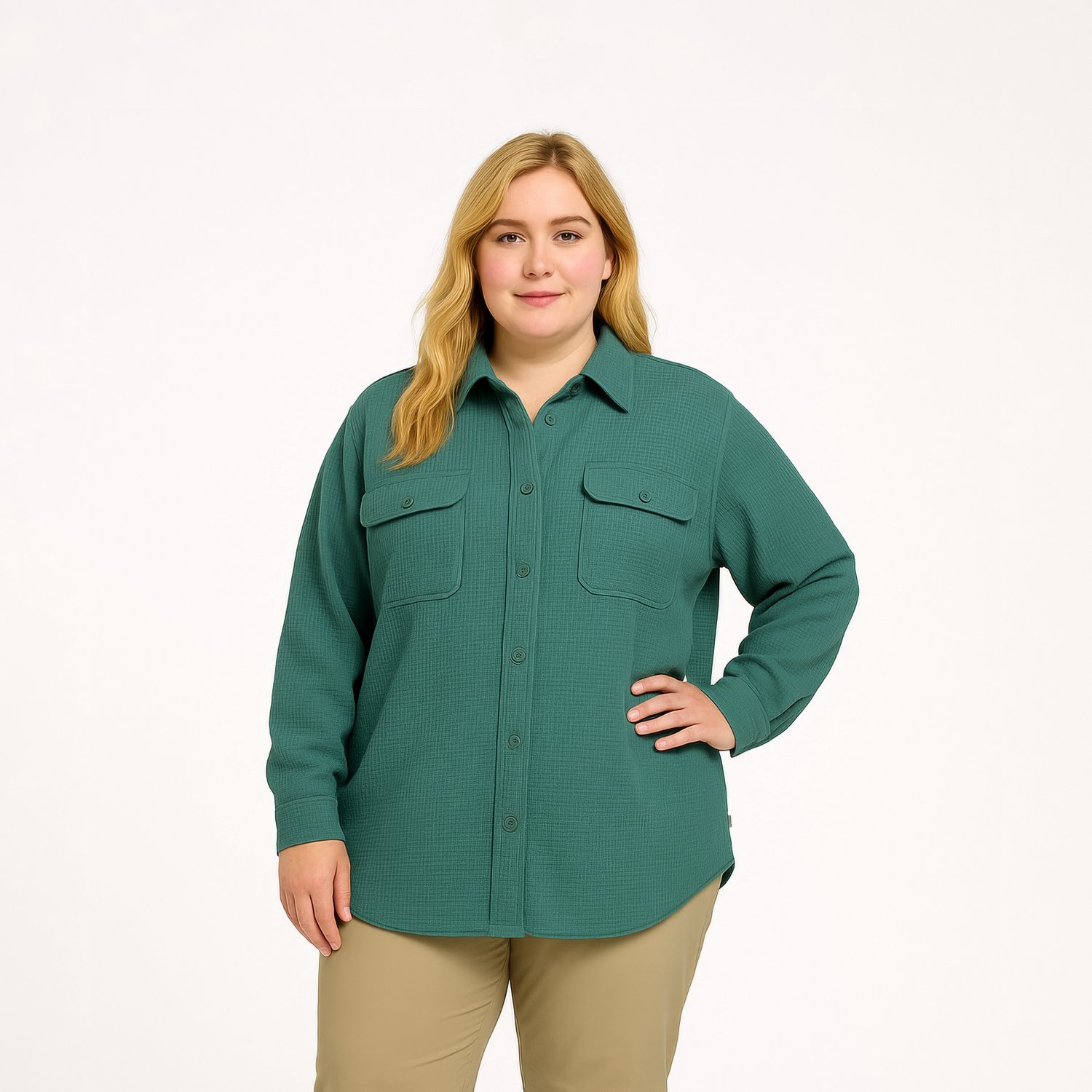 Features and Benefits Cotton and polyester waffle fabric offers comfort Long sleeves Collar Button-down style Oversized fit Specifications Insulation: No Temperature: Mild Clothing Type: Jackets Sleeve length: Long Sleeve Activity: Casual,Camping,Hiking Material: Cotton blend, Polyester blend Heat Retention: No Gender: Women's Zipper: No Zipper Size Range: Women's Jacket Length: Hip Moisture Wicking: No Care: Machine wash Water Resistant: No Fit: Relaxed Product Type: Outerwear Flame Resistant: No Age Group: Adults' Style: Shackets Lining: No Hood: No What's in the Box Magellan Outdoors Women's Happy Camper Oversized Waffle Shirt Jacket