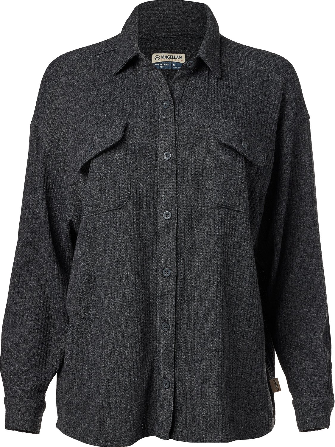 Elevate your everyday wardrobe with the Magellan Outdoors Women's Happy Camper Waffle Shirt Jacket. This cozy waffle knit top is perfect for wearing around the campfire, with just enough stretch to let you move naturally.