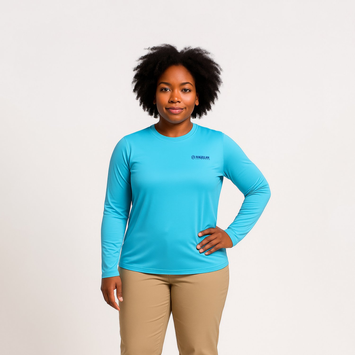 Sport the Magellan Women's Local State GFX Alabama Long Sleeve T-shirt for any adventure that comes your way. The shirt is made of 100% knit polyester solid interlock for durability, and it comes with moisture-wicking technology and UPF 50 sun protection for comfortable wear. The shirt also features a graphic print on the back for a touch of style.