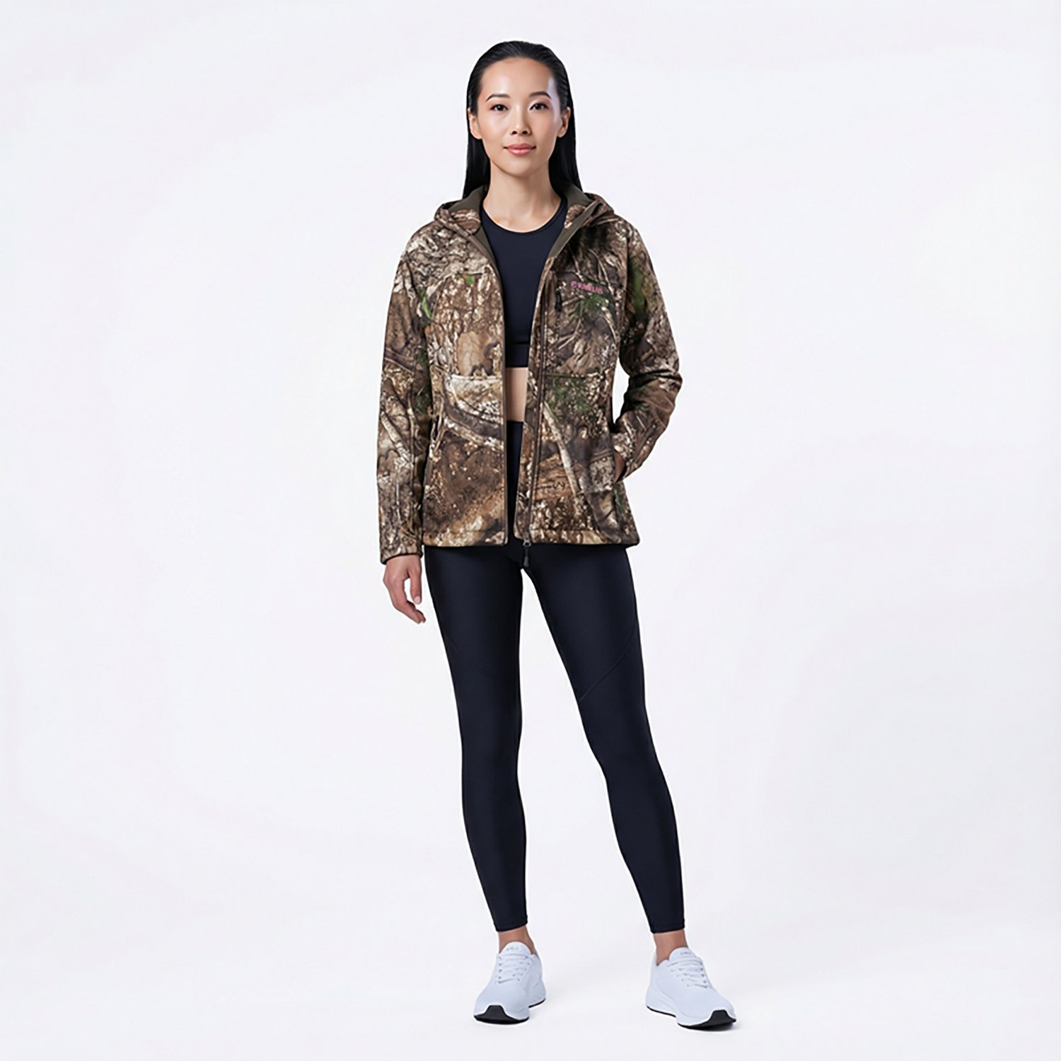 Stay warm and dry during mild-weather hunts with the Magellan Outdoors Women's Mesa 2.0 Softshell Jacket. This midweight polyester jacket has a DWR finish and a TPU laminate coating for protection from the wind and water, helping you stay warm and dry. The fabric is designed to move silently, so you can sneak up on game animals. With five zippered pockets and a safety-harness pass-through, this jacket is both functional and comfortable.