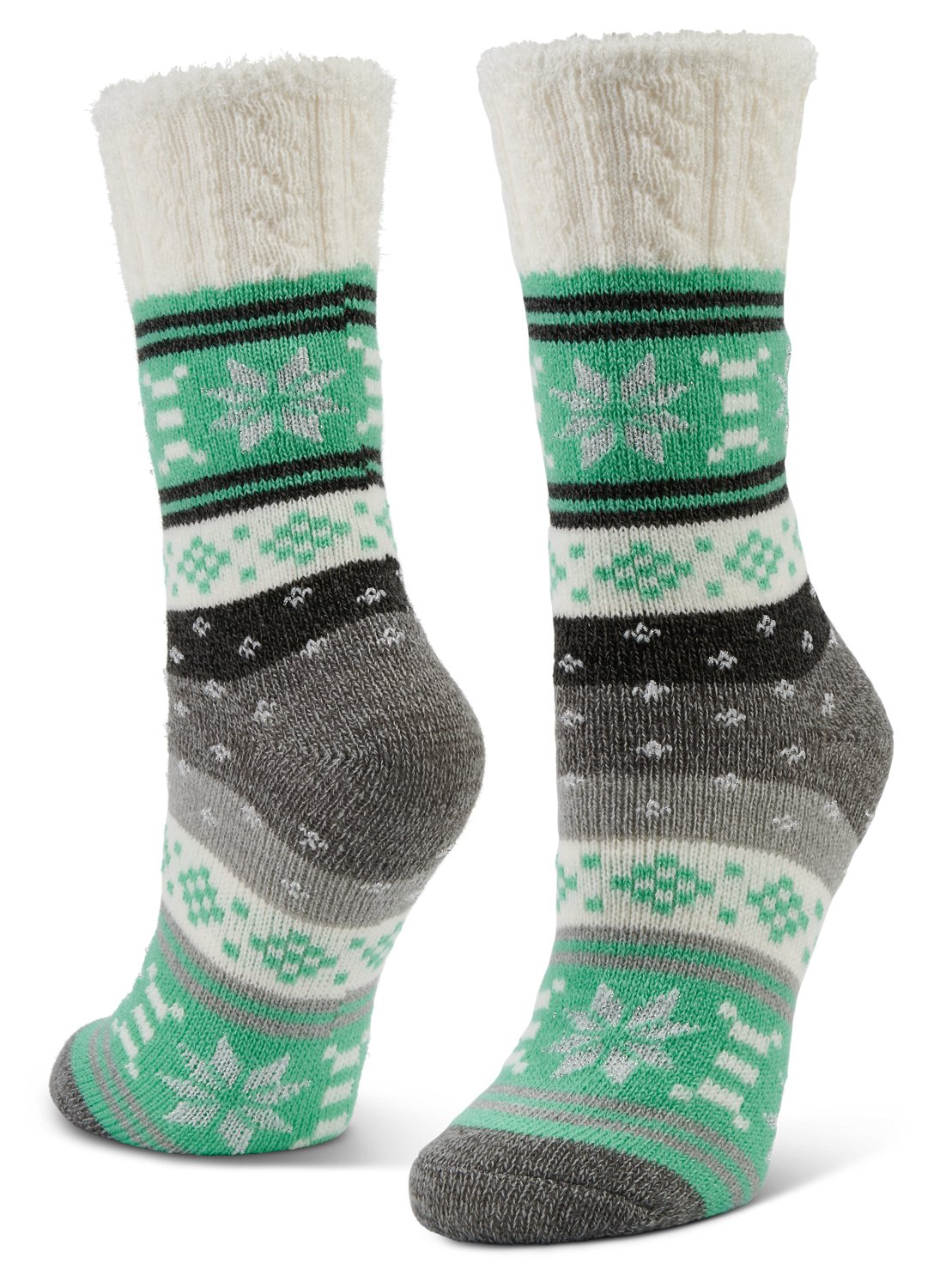 Finish off your outfit with the Magellan Outdoors Women's Metallic Snow Mid Calf Crew Socks. The acrylic and polyester blend provides a comfortable feel and warmth, while the aloe-infused construction offers softness and helps keep your feet feeling moisturized.