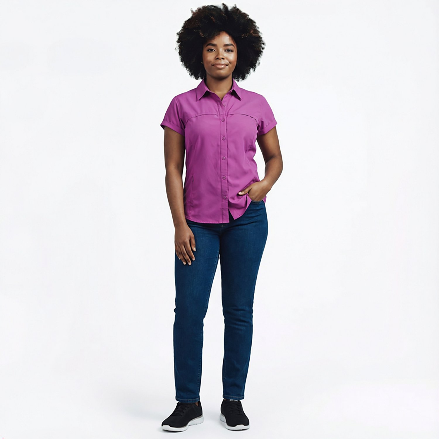 Feel prepared to make a big catch in the Magellan Outdoors Women's Overcast Fishing Button-Down Shirt. The durable 100% polyester, moisture-wicking fabric delivers a cool and comfortable fit, and capped sleeves ensure your movements stay free. The 30+ UPF Protectant technology provides safety against harmful sun rays.