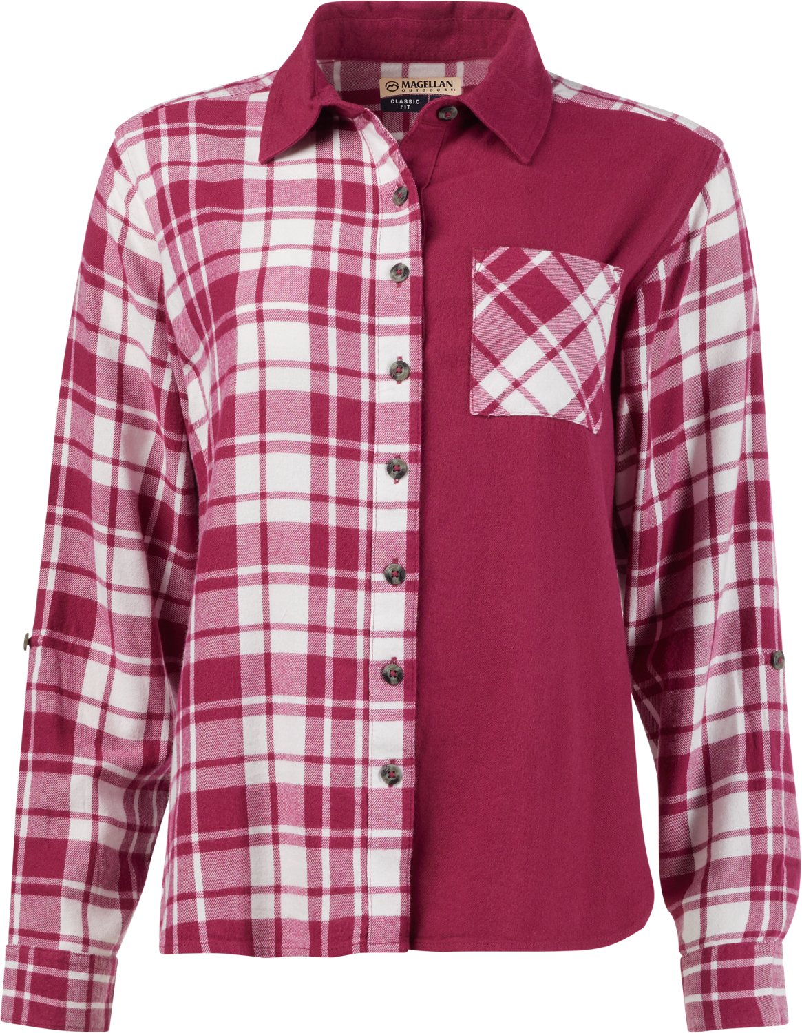 Add style to your wardrobe with the Magellan Outdoors Women's Willow Creek Mixed Media Plaid Long Sleeve Blouse. The cotton and viscose material is gentle, and the loose fit gives you an easygoing wearing experience. The collar adds a classy look to the garment.