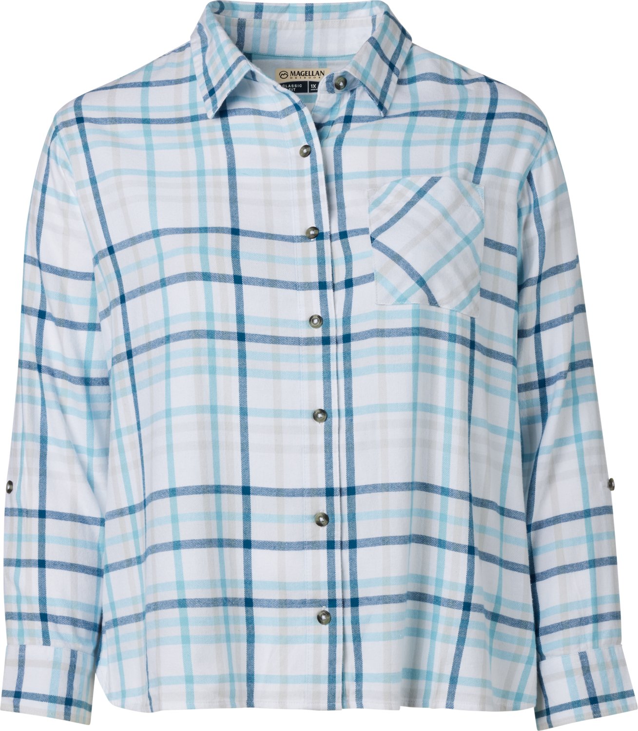 Explore the great outdoors with the Magellan Outdoors Women's Willow Creek Plaid Plus Size Long Sleeve T-shirt. The cotton and viscose material provides a comfortable feel, while the long sleeves and crew neck offer a classic fit. The plaid pattern adds a stylish touch.