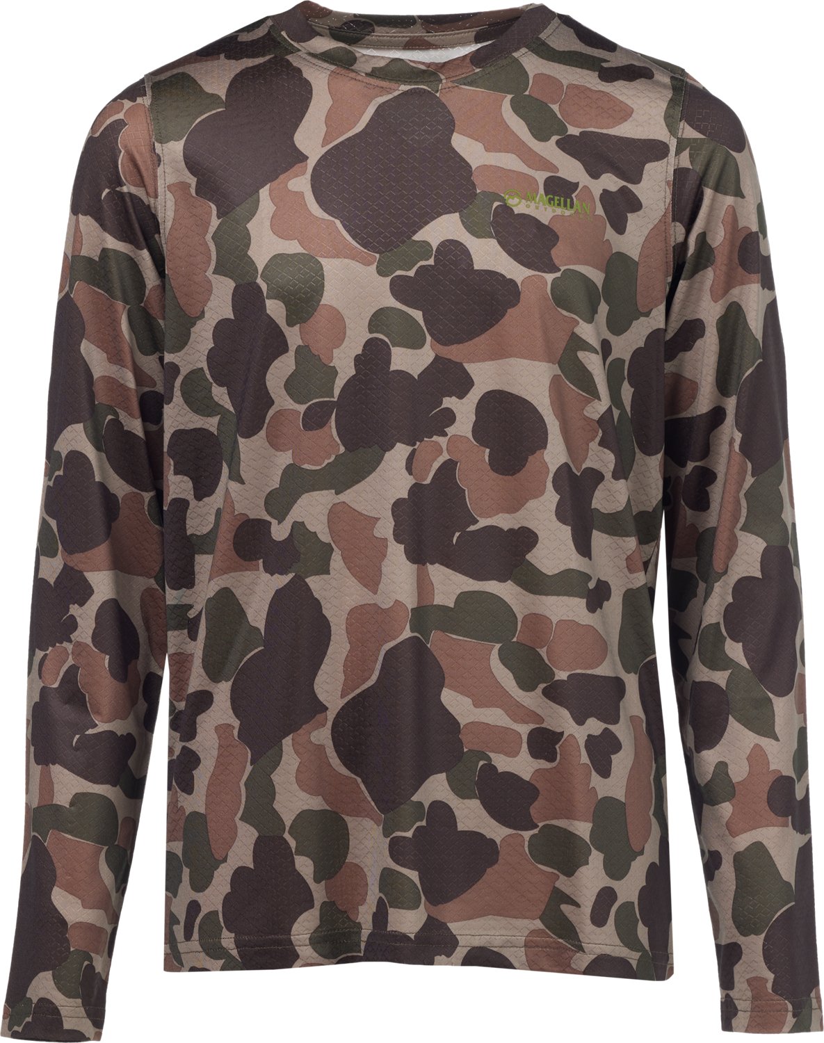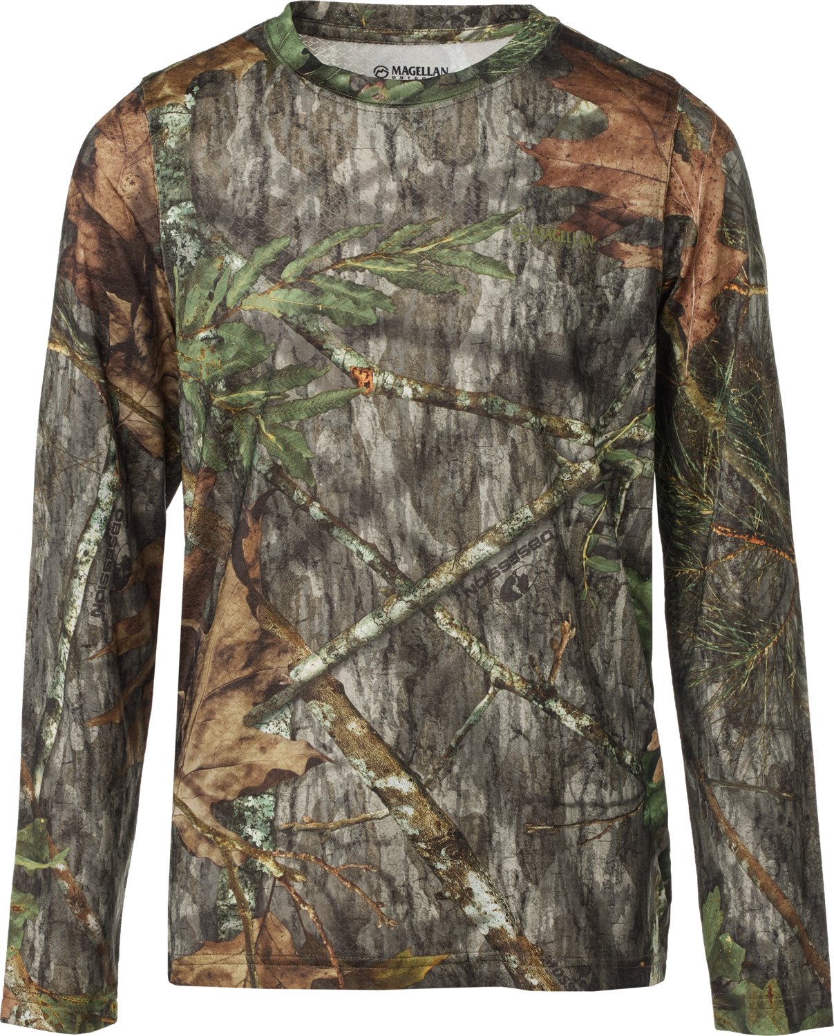 He can out to the field in the Magellan Outdoors Hunt Gear Youth Eagle Pass Tech Mesh Long Sleeve T-shirt. This T-shirt is made of polyester and spandex mesh fabric for comfortable wear. The moisture wicking technology helps keep him cool and dry, while the camo print offers concealability.