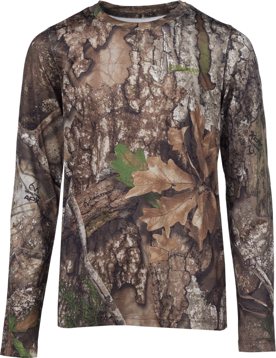 He can out to the field in the Magellan Outdoors Hunt Gear Youth Eagle Pass Tech Mesh Long Sleeve T-shirt. This T-shirt is made of polyester and spandex mesh fabric for comfortable wear. The moisture wicking technology helps keep him cool and dry, while the camo print offers concealability.