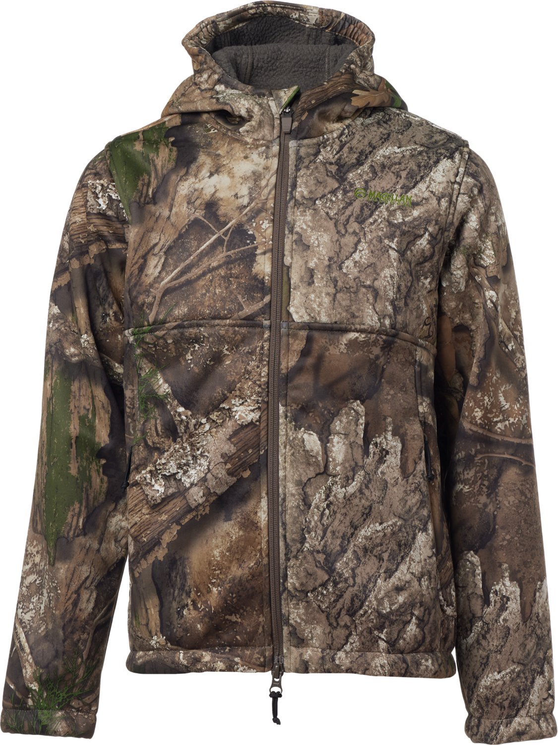 Stay warm and dry during mild-weather hunts with the Magellan Outdoors Youth Mesa 2.0 Softshell Jacket. This midweight polyester jacket has a DWR finish and a TPU laminate coating for protection from the wind and water, helping you stay warm and dry. The fabric is designed to move silently, so you can sneak up on game animals. With five zippered pockets and a safety-harness pass-through, this jacket is both functional and comfortable.