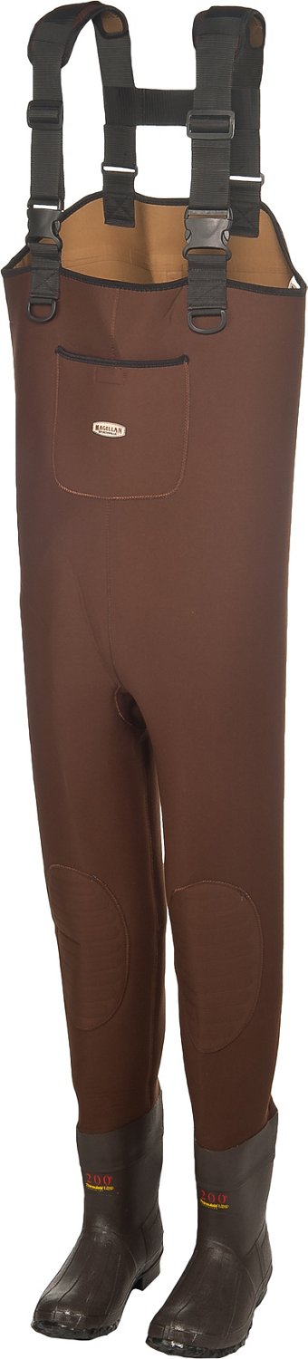 The Magellan Outdoors™ Men's Neoprene Bootfoot Waders feature 85% neoprene and 15% polyester construction and 200 grams of Thinsulate™ insulation within the rubber boots. Adjustable suspenders with neoprene shoulder pads. Reinforced, molded knees. Front storage pocket.