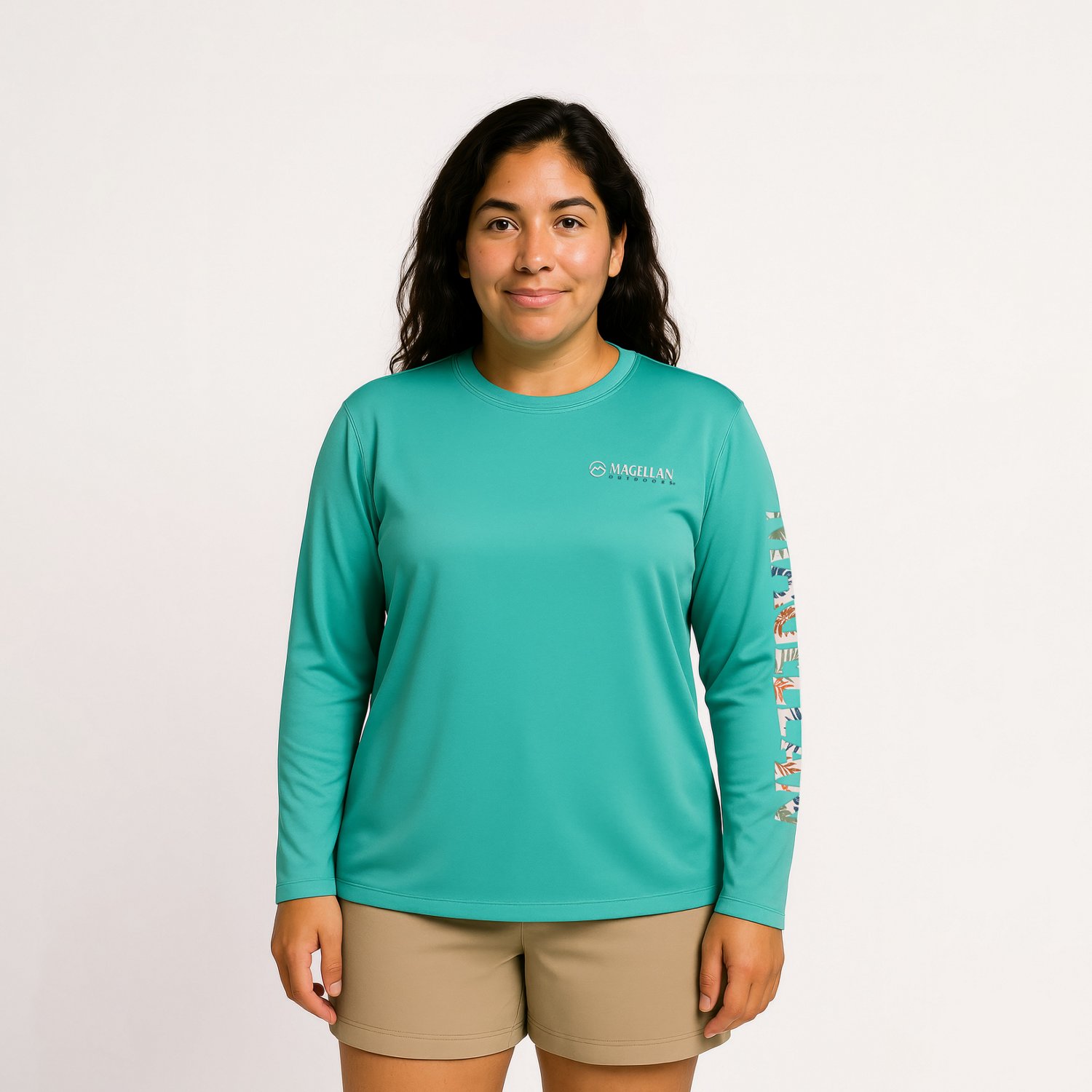The Magellan Outdoors Women's Caddo Lake Logo Long Sleeve T-Shirt offers comfort and style for women's fishing and outdoor activities. This long sleeve athletic shirt features Moisture Wicking Technology, helping to keep you dry and comfortable. Crafted from 50% recycled polyester and 50% polyester, it includes UPF 50 sun protection and a quick-drying design. A fun graphic adds a unique touch to this performance tee.
