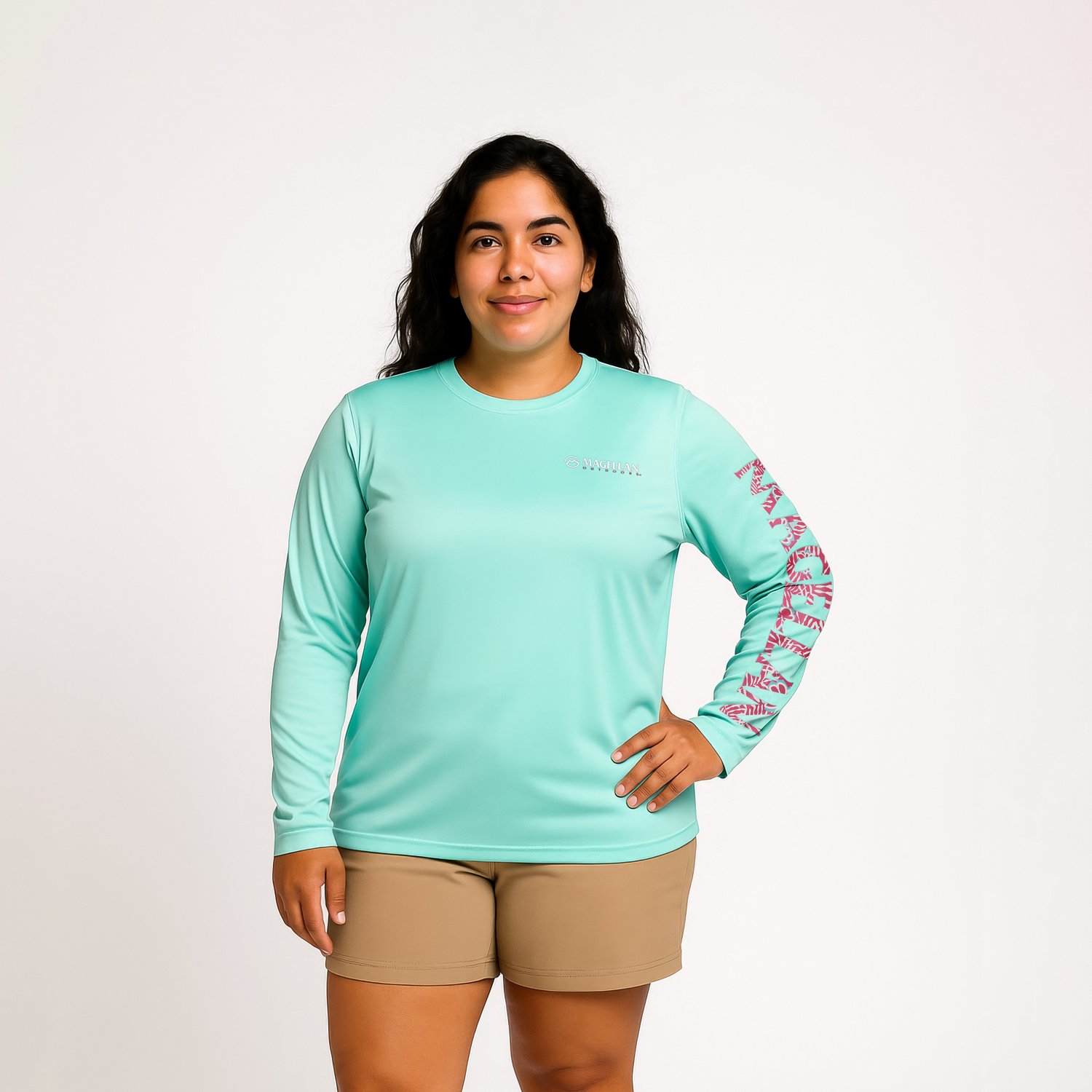 The Magellan Outdoors Women's Caddo Lake Logo Long Sleeve T-Shirt offers comfort and style for women's fishing and outdoor activities. This long sleeve athletic shirt features Moisture Wicking Technology, helping to keep you dry and comfortable. Crafted from 50% recycled polyester and 50% polyester, it includes UPF 50 sun protection and a quick-drying design. A fun graphic adds a unique touch to this performance tee.