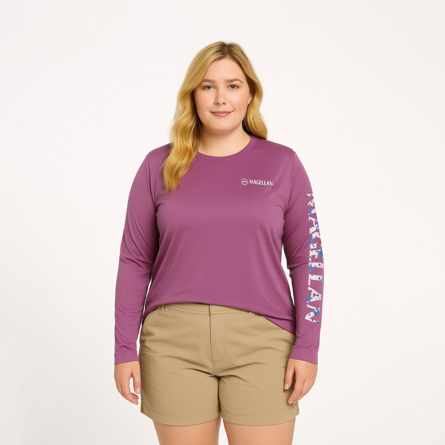 The Magellan Outdoors Women's Caddo Lake Logo Long Sleeve T-Shirt offers comfort and style for women's fishing and outdoor activities. This long sleeve athletic shirt features Moisture Wicking Technology, helping to keep you dry and comfortable. Crafted from 50% recycled polyester and 50% polyester, it includes UPF 50 sun protection and a quick-drying design. A fun graphic adds a unique touch to this performance tee.
