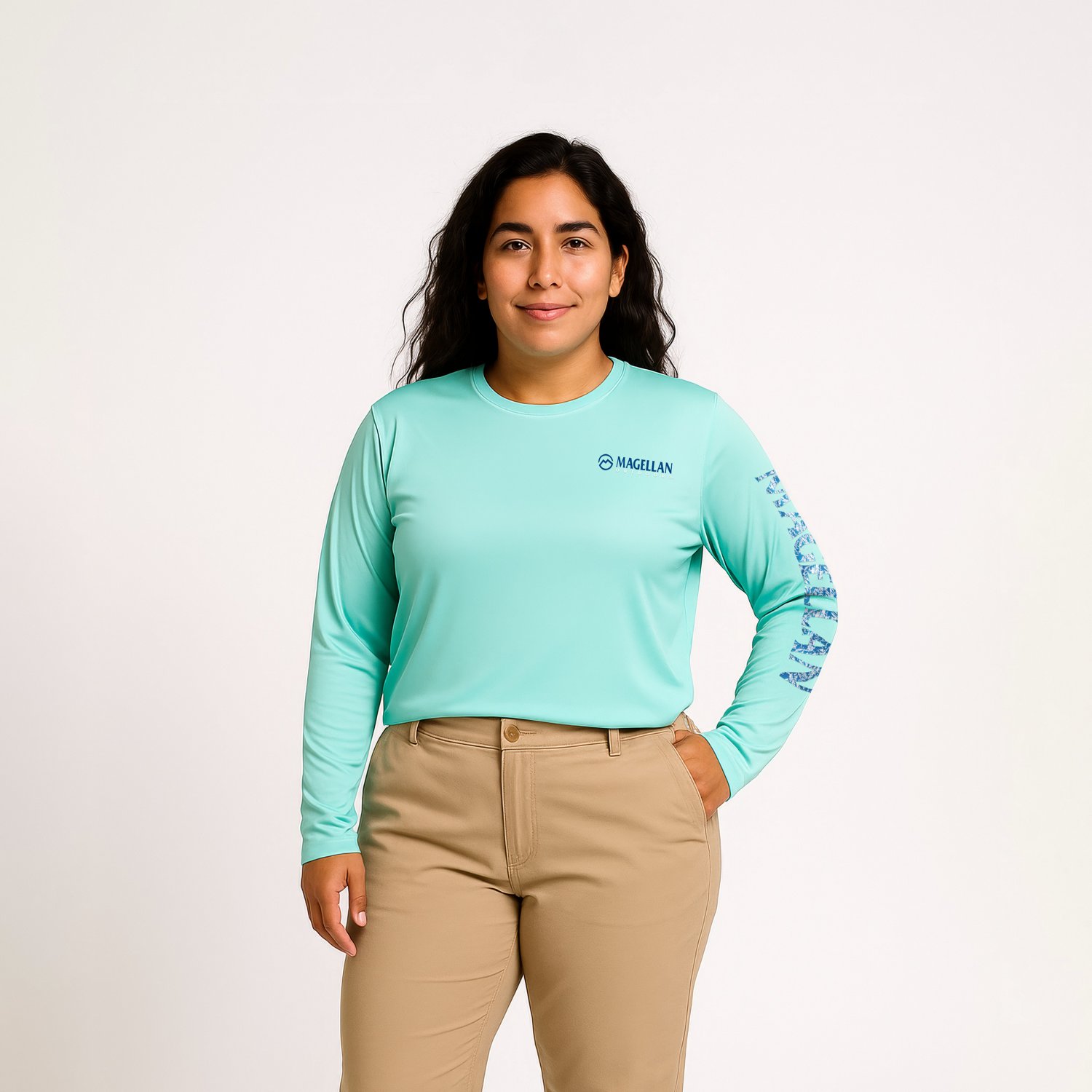 The Magellan Outdoors Women's Caddo Lake Logo Long Sleeve T-Shirt offers comfort and style for women's fishing and outdoor activities. This long sleeve athletic shirt features Moisture Wicking Technology, helping to keep you dry and comfortable. Crafted from 50% recycled polyester and 50% polyester, it includes UPF 50 sun protection and a quick-drying design. A fun graphic adds a unique touch to this performance tee.
