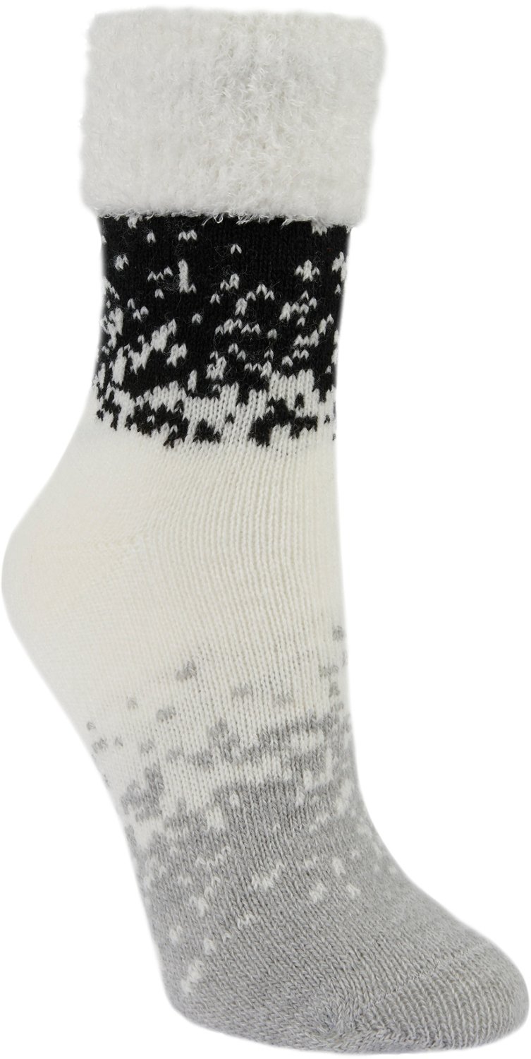 Add some color to your look with the Magellan Women's Fold-Over Splatter Zephyr Crew Lodge Socks. These fold-over crew socks are made of double-layered construction with polyester, acrylic, rubber, and spandex materials for all-day comfort and warmth. They are naturally infused with aloe for added comfort and have a splatter print for colorful style.