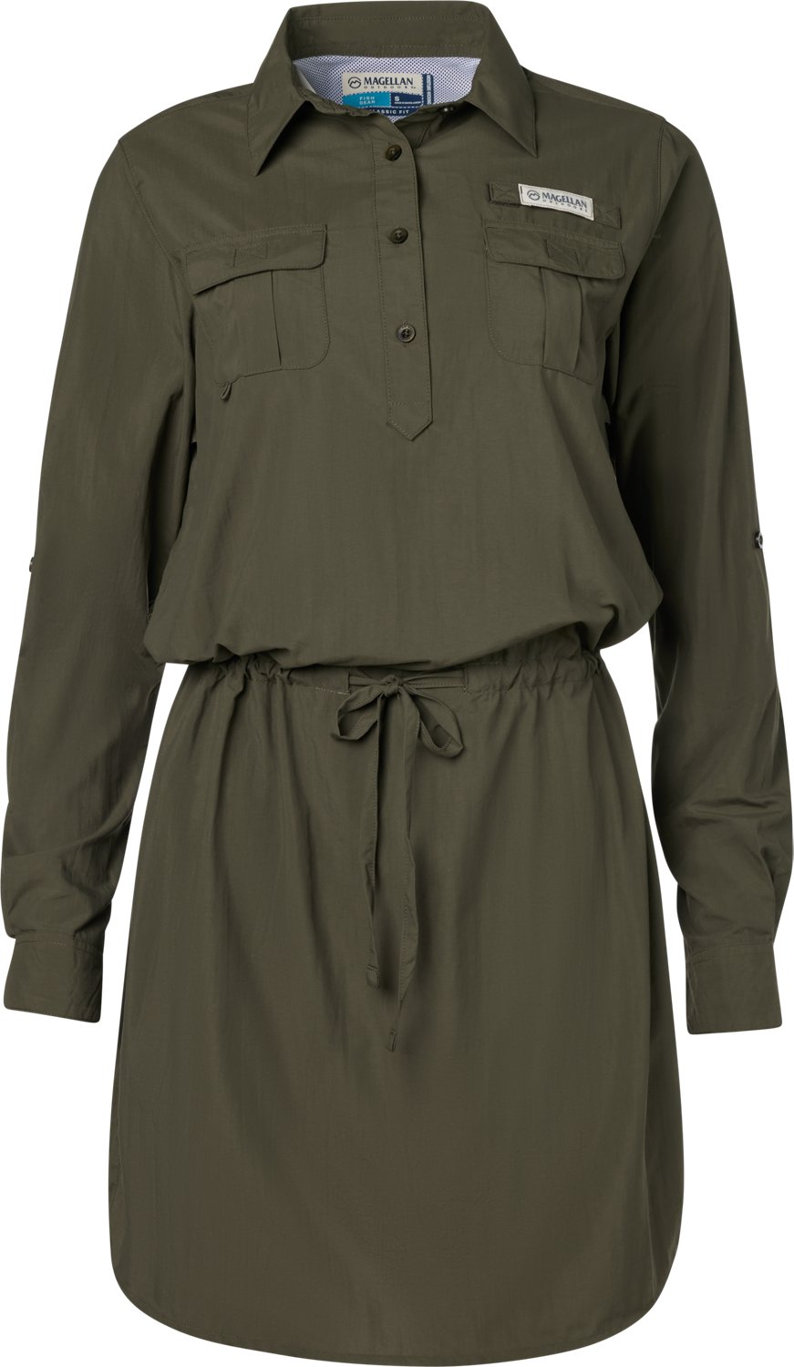 Look your best when you wear the Magellan Outdoors Women's Laguna Madre Long Sleeve Fishing Dress. It is made of 100% nylon. The moisture wicking technology wicks away sweat and quickly dries, and its UPF 30 provides protection against the sun. The woven mesh lining offers ventilation.