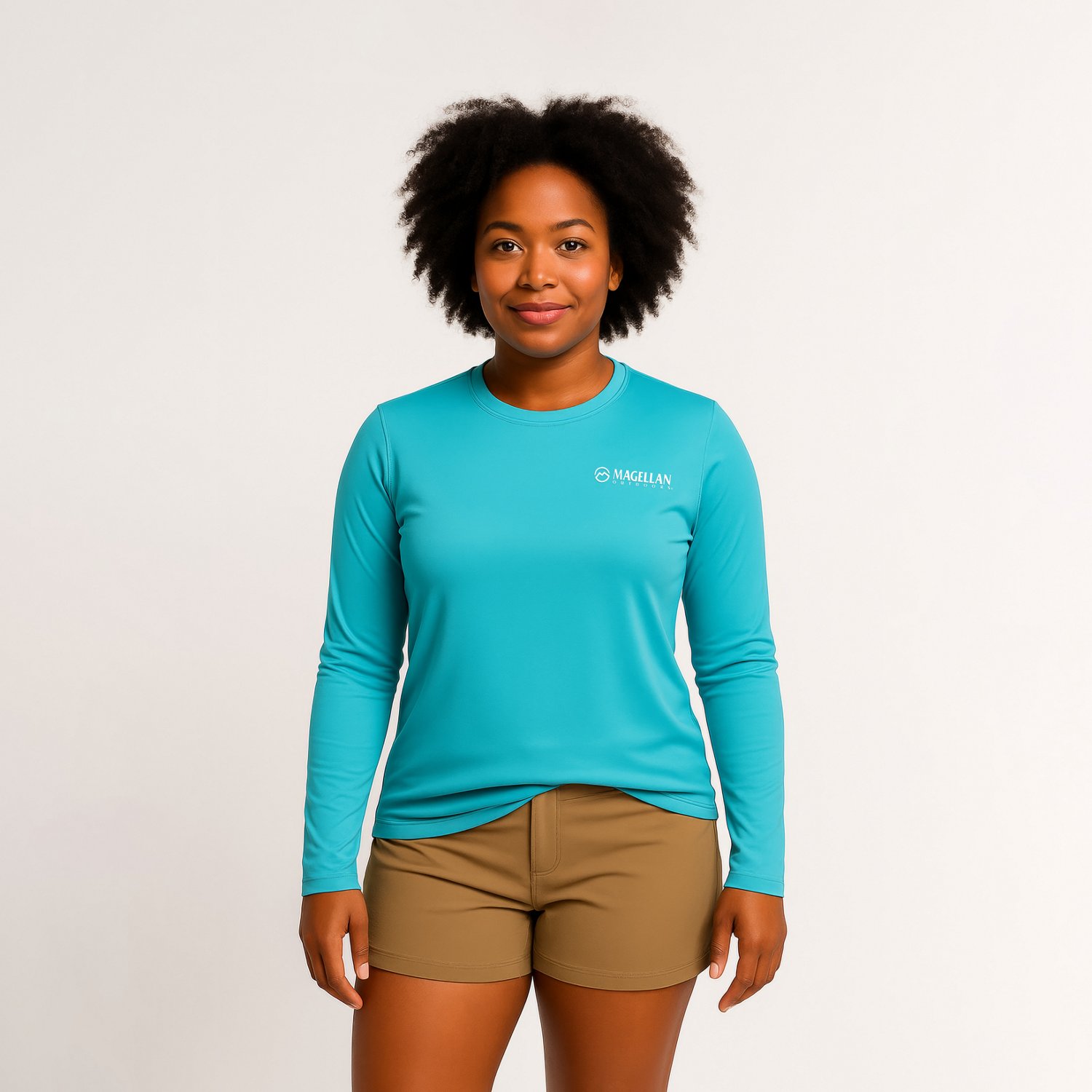 Wear the Magellan Women's Local State GFX Kansas Long Sleeve T-shirt for any occasion that comes your way. Made of 100% knit polyester solid interlock for durability, this shirt comes with moisture-wicking technology and UPF 50 sun protection for comfortable wear. The shirt also features a graphic print on the back for a unique appearance.
