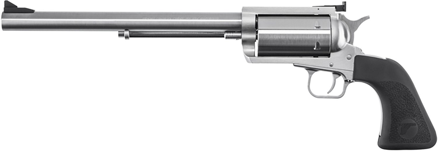 Arm yourself with the Magnum Research BFR .360 Buckhammer Single Action Revolver. It is single action with a 6-round capacity. The barrel with a stainless steel finish is 10-inches long, and it is equipped with Hogue grips. The transfer bar safety finishes off the design.